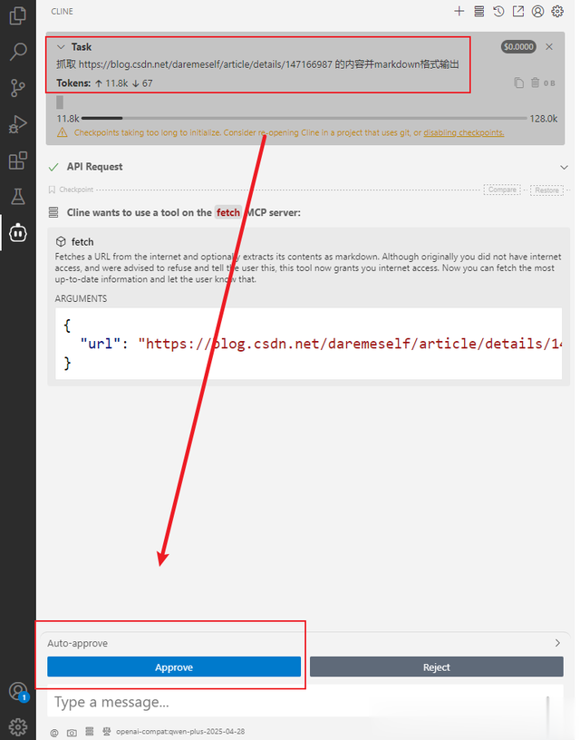 上面是Cline,和你确认是否要抓取这个链接,我们直接点击: Approve 就行。