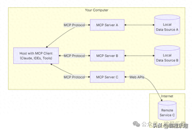 简单来说,就是让我们应用调用大模型,大模型要调用外部数据都变得通用。只要大模型遵守了MCP规范,AI应用就可以快速接入。只要你的数据源遵守MCP规范,也很方便AI应用、或者大模型调用。