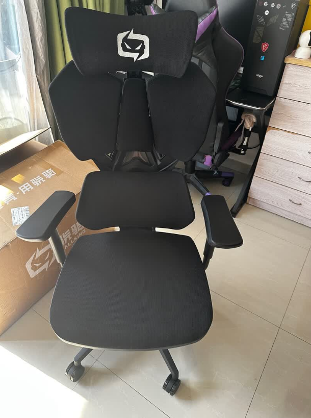 座垫加宽加厚,网布与海绵结合,坐感偏柔和有回弹。后仰角度大,放松时包裹感明显。整体支撑位置自然,久坐舒适度尚可,适合长时间工作,也能兼顾短暂休息需求。