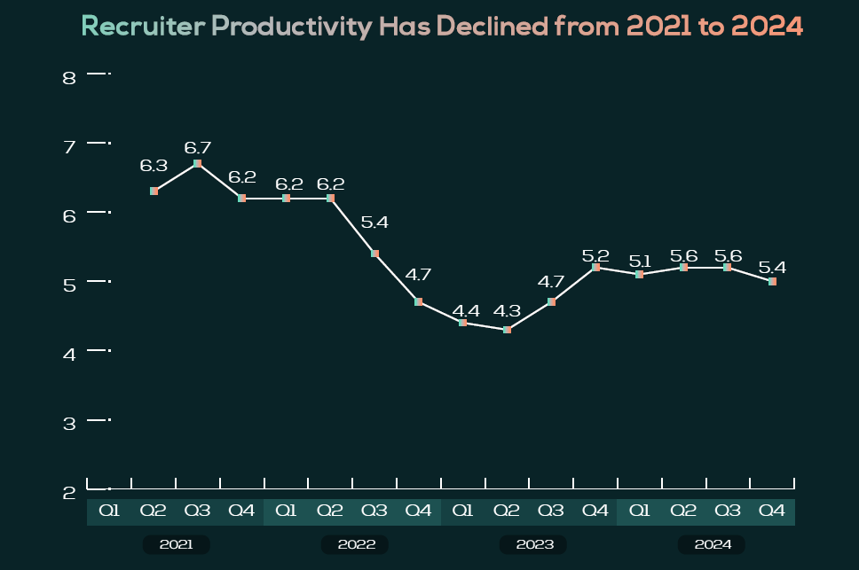 (过去几年,招聘人员的生产力呈明显下滑趋势,阶段性波动频繁。“流水线模式”已成为制约招聘效率与质量的核心瓶颈。)