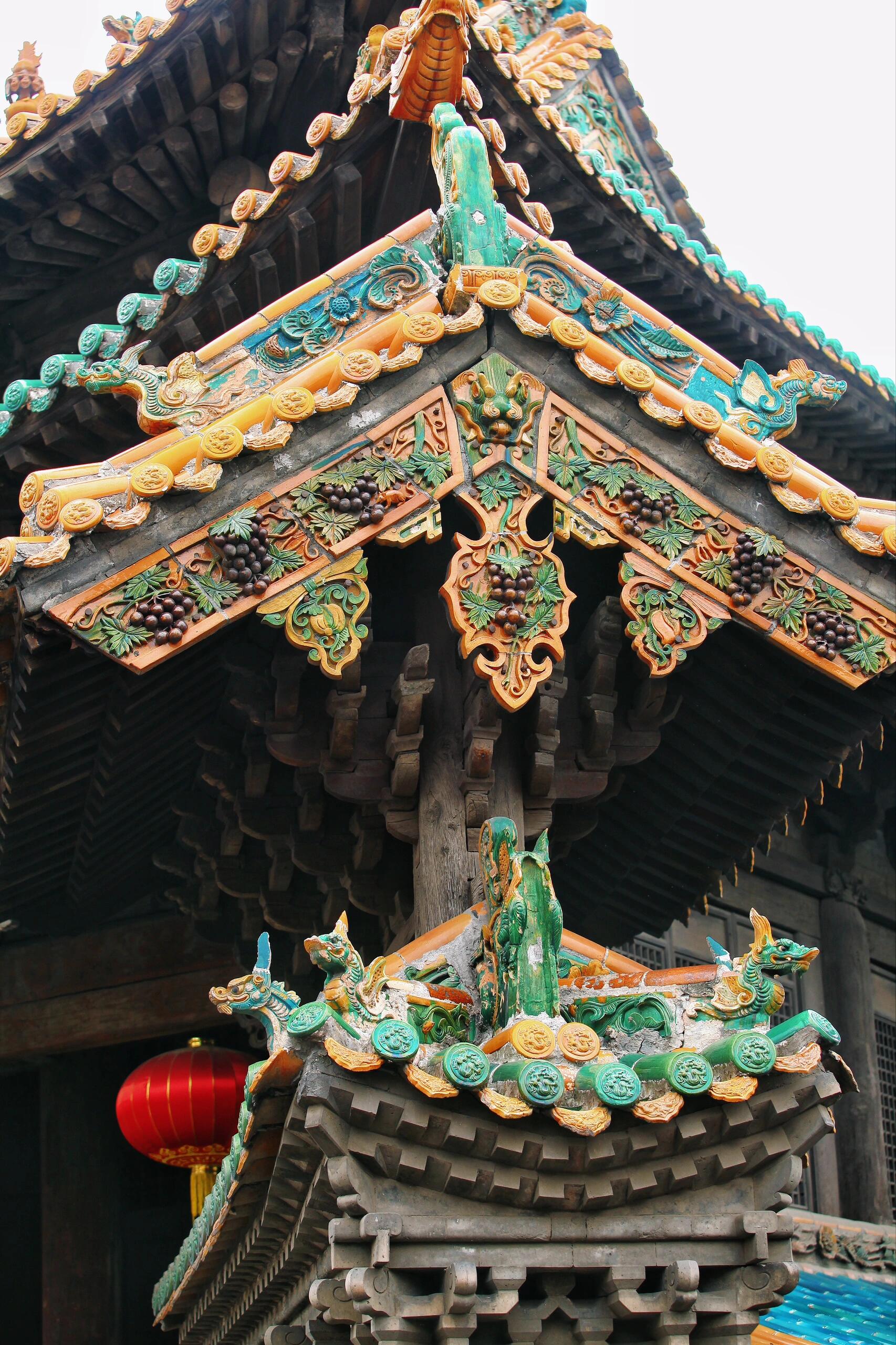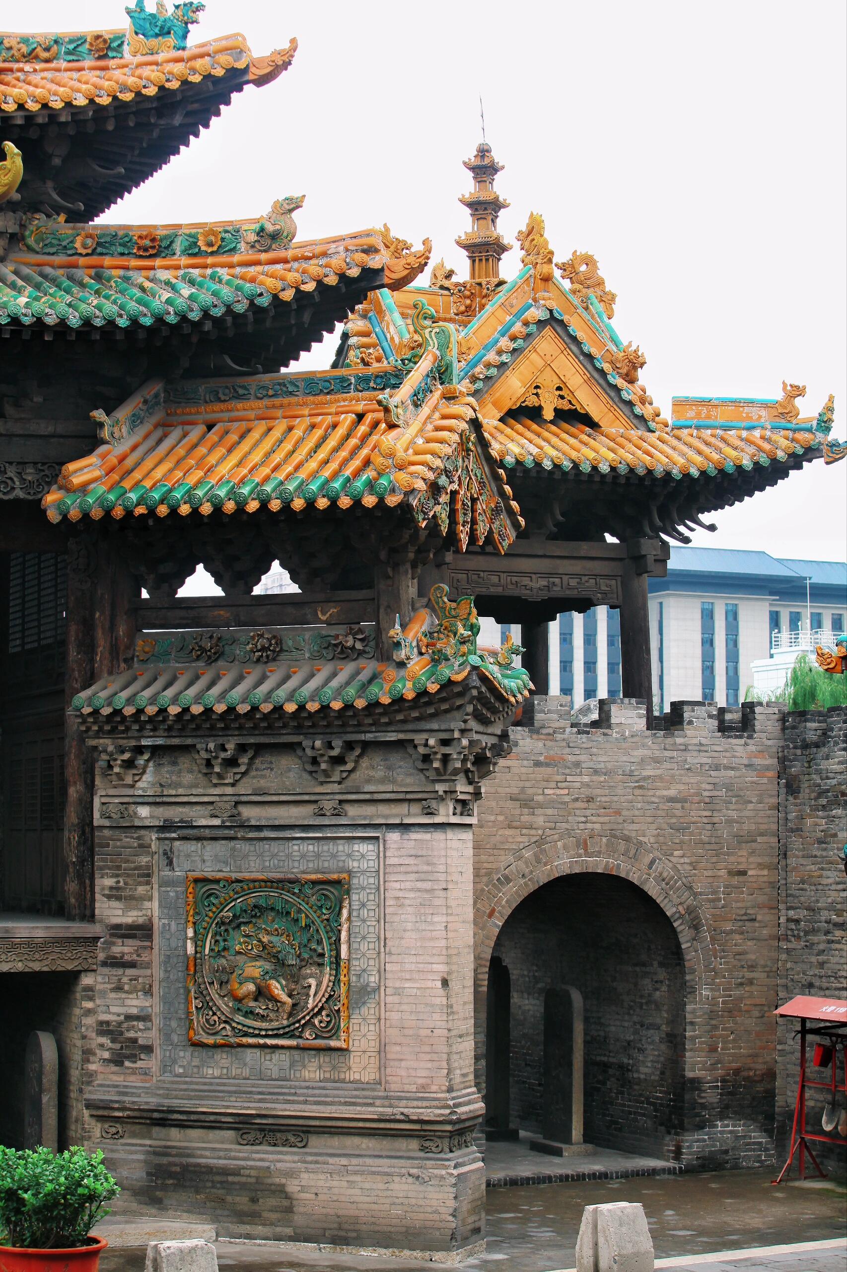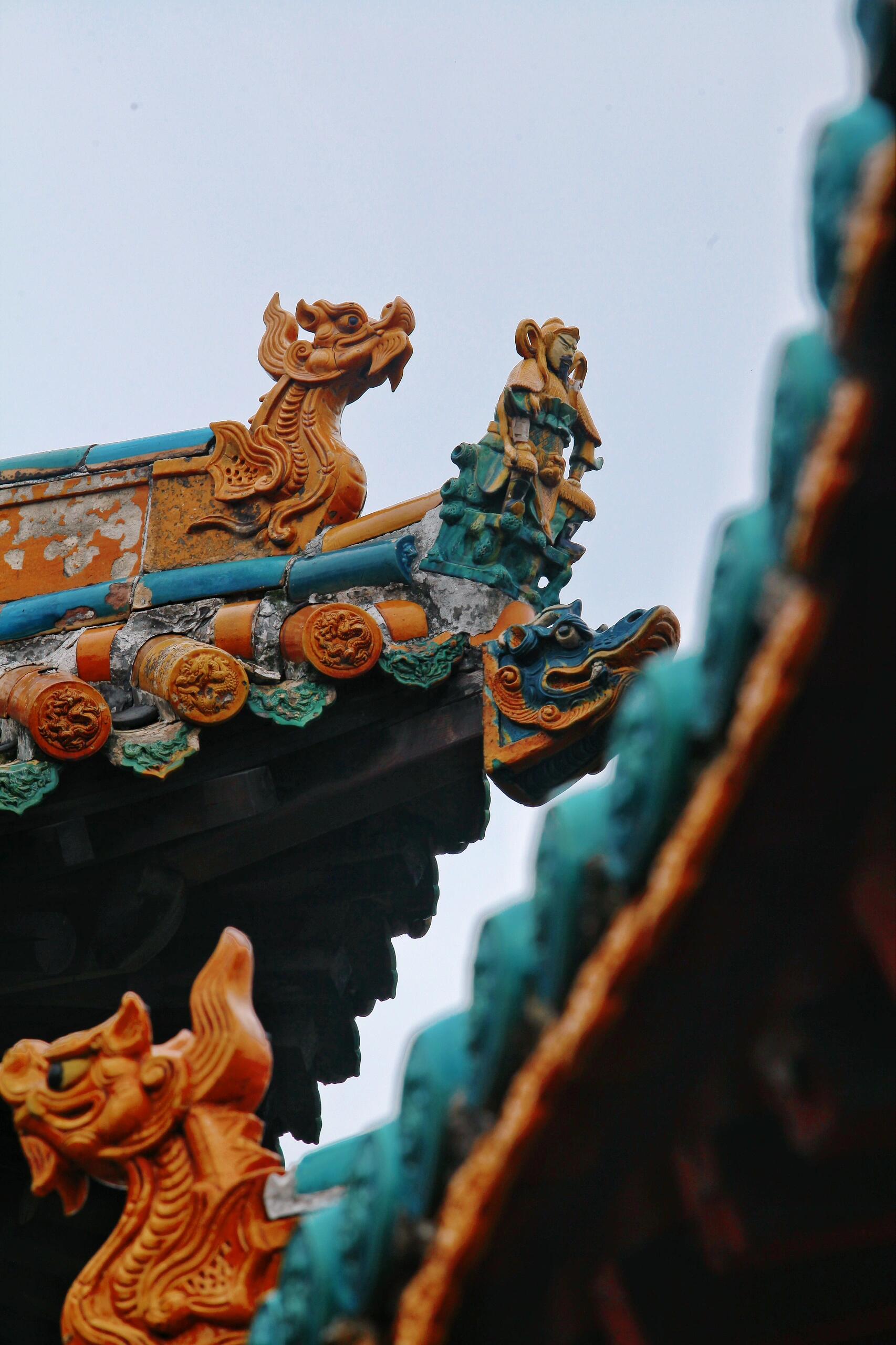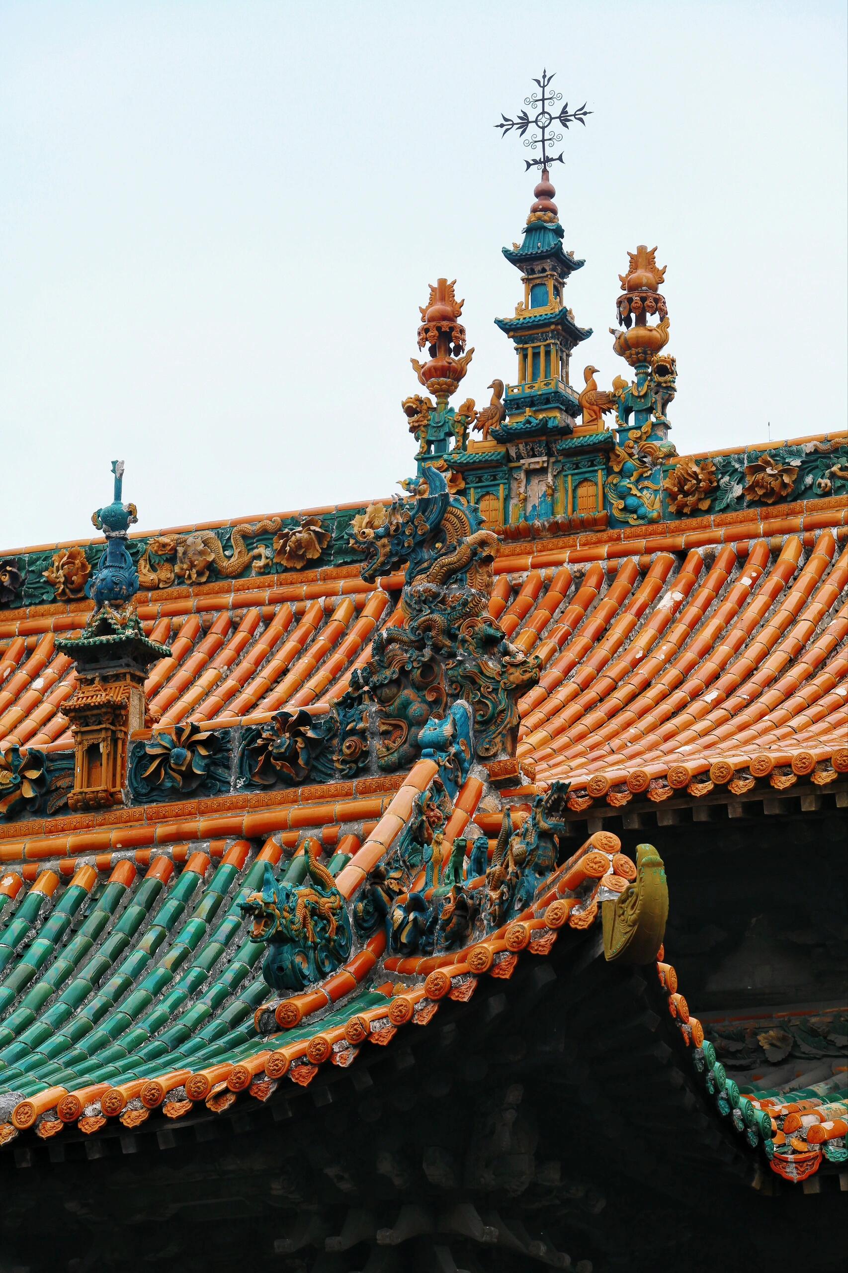 踏入后土庙,首先被震撼的是视觉的强烈冲击。主体建筑三清楼如同被琉璃包裹的艺术圣殿,整座楼顶仿佛打翻了明代的皇家色盘:黄绿二色琉璃瓦在阳光下流转出丝绸般的光泽,拼接成规整的方心几何图形,像极了古人绘制的精密星图。屋脊之上,琉璃阁高耸而立,狮瓶、吻鸱、龙凤浮雕层层叠叠,每一处细节都堪称鬼斧神工——狮鬃根根分明,龙须随风舞动,凤凰尾羽的琉璃釉色竟能呈现出渐变的虹彩。最令人叫绝的是,这些琉璃历经五百多个春秋的风吹雨打,釉面依然光洁如新,色彩饱和度甚至超越许多现代工艺品,让人不禁怀疑明代工匠是否掌握着失传的“琉璃不老术”。