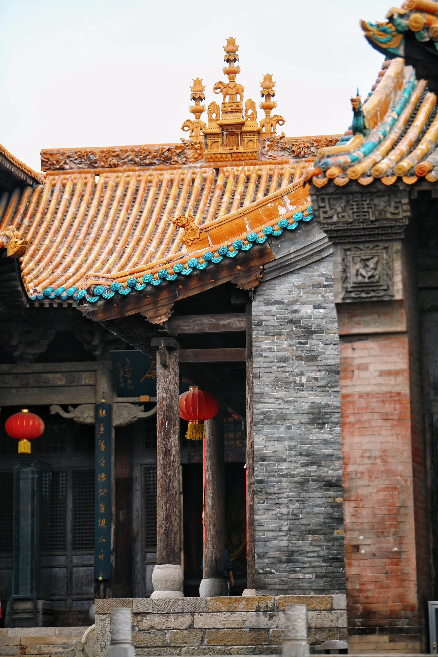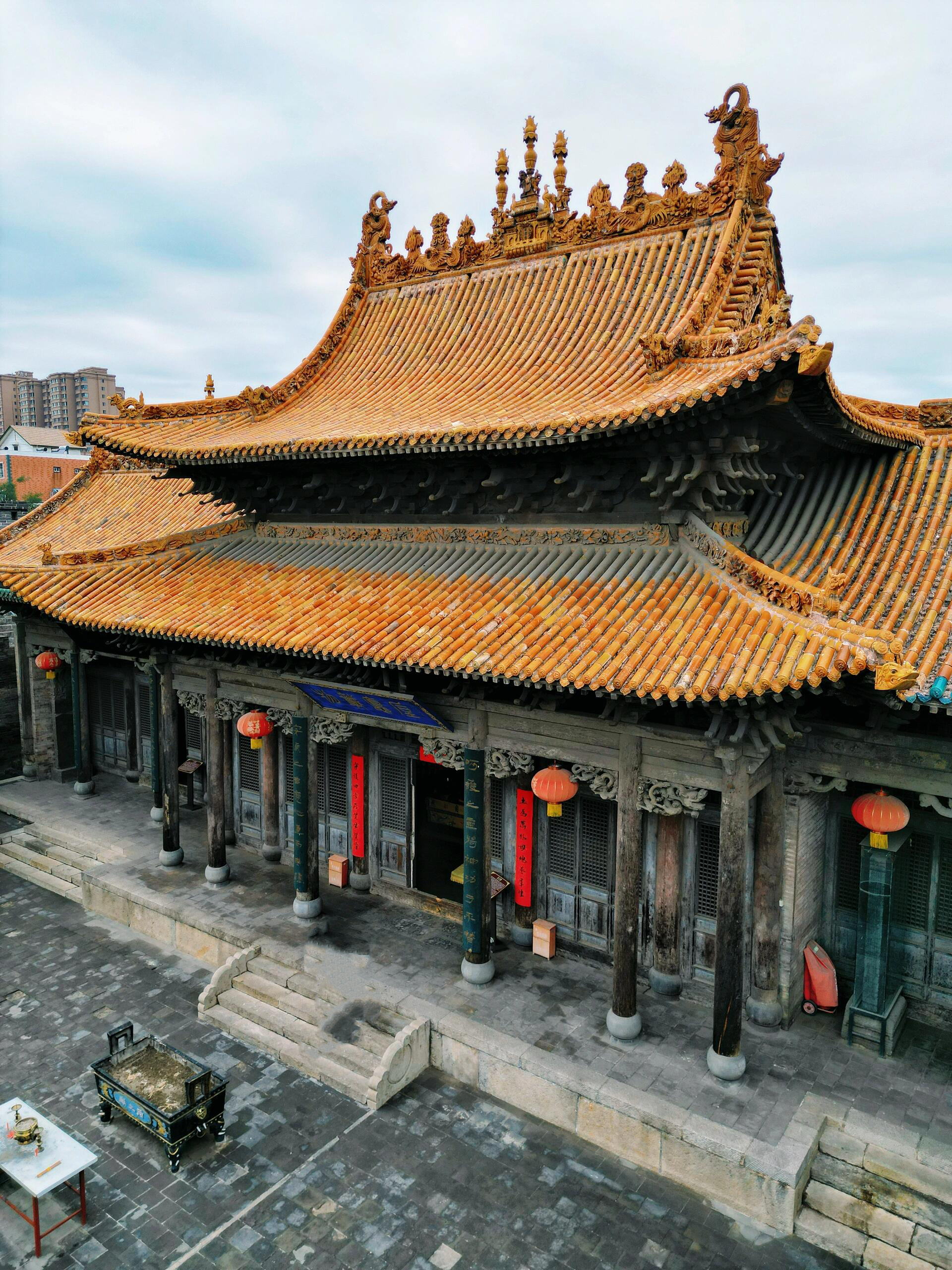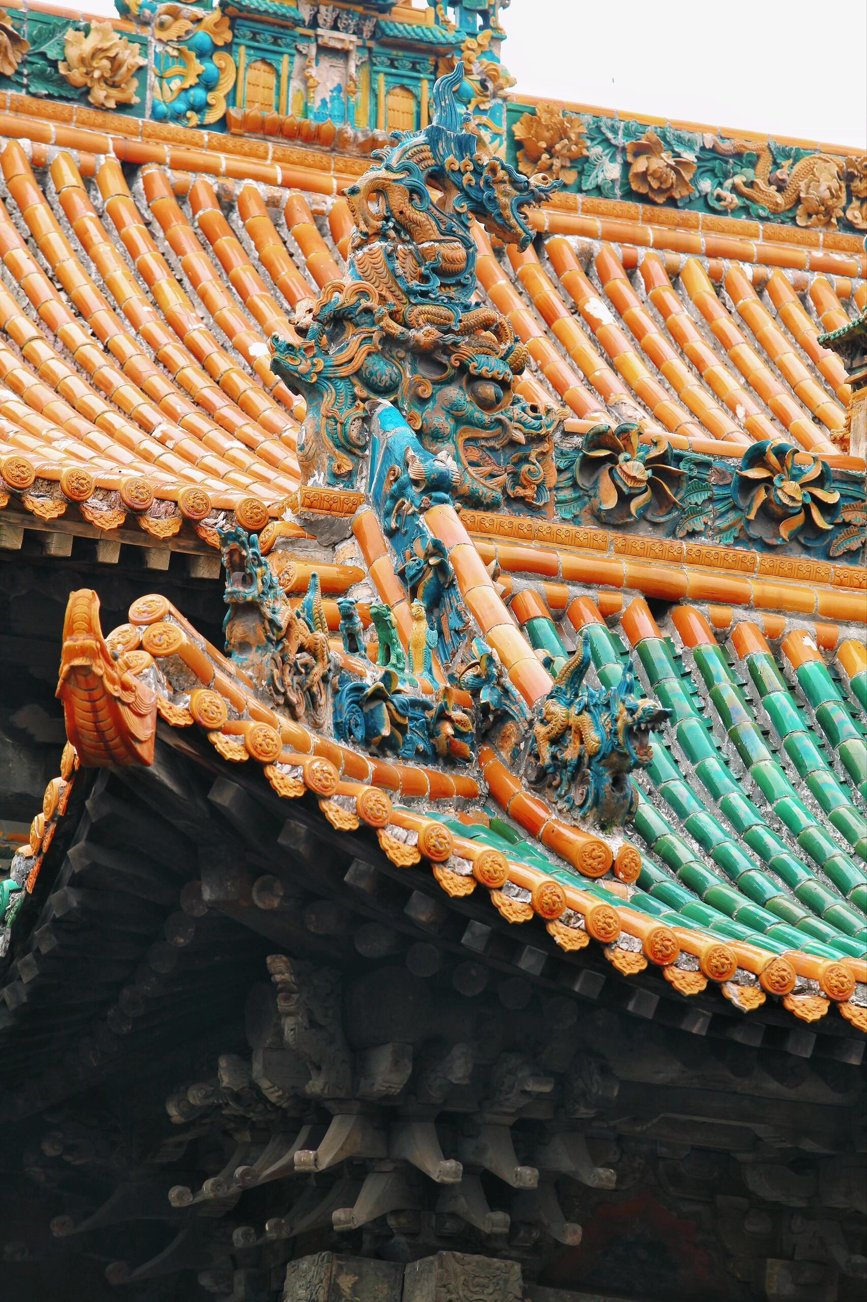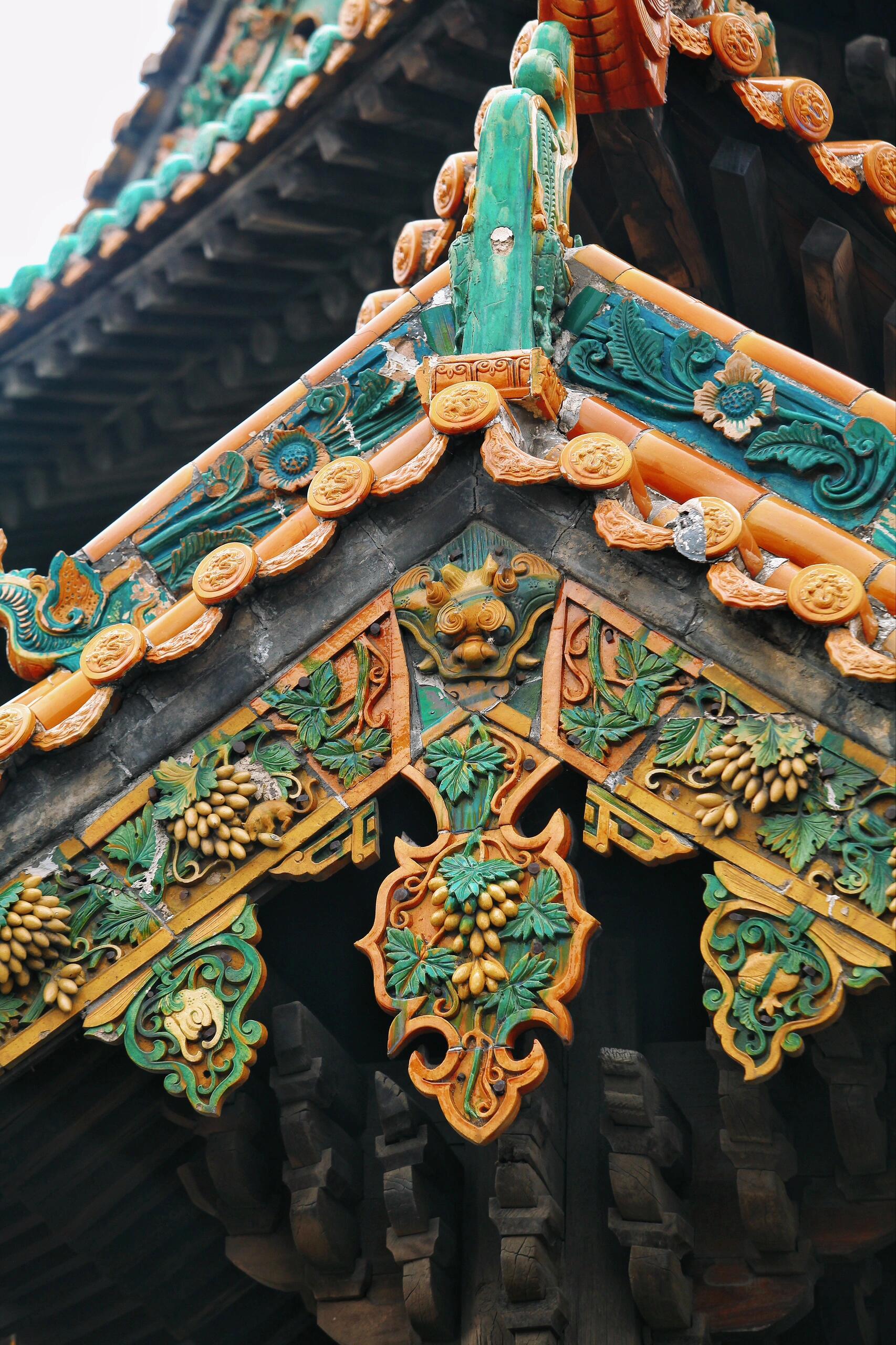 踏入后土庙,首先被震撼的是视觉的强烈冲击。主体建筑三清楼如同被琉璃包裹的艺术圣殿,整座楼顶仿佛打翻了明代的皇家色盘:黄绿二色琉璃瓦在阳光下流转出丝绸般的光泽,拼接成规整的方心几何图形,像极了古人绘制的精密星图。屋脊之上,琉璃阁高耸而立,狮瓶、吻鸱、龙凤浮雕层层叠叠,每一处细节都堪称鬼斧神工——狮鬃根根分明,龙须随风舞动,凤凰尾羽的琉璃釉色竟能呈现出渐变的虹彩。最令人叫绝的是,这些琉璃历经五百多个春秋的风吹雨打,釉面依然光洁如新,色彩饱和度甚至超越许多现代工艺品,让人不禁怀疑明代工匠是否掌握着失传的“琉璃不老术”。