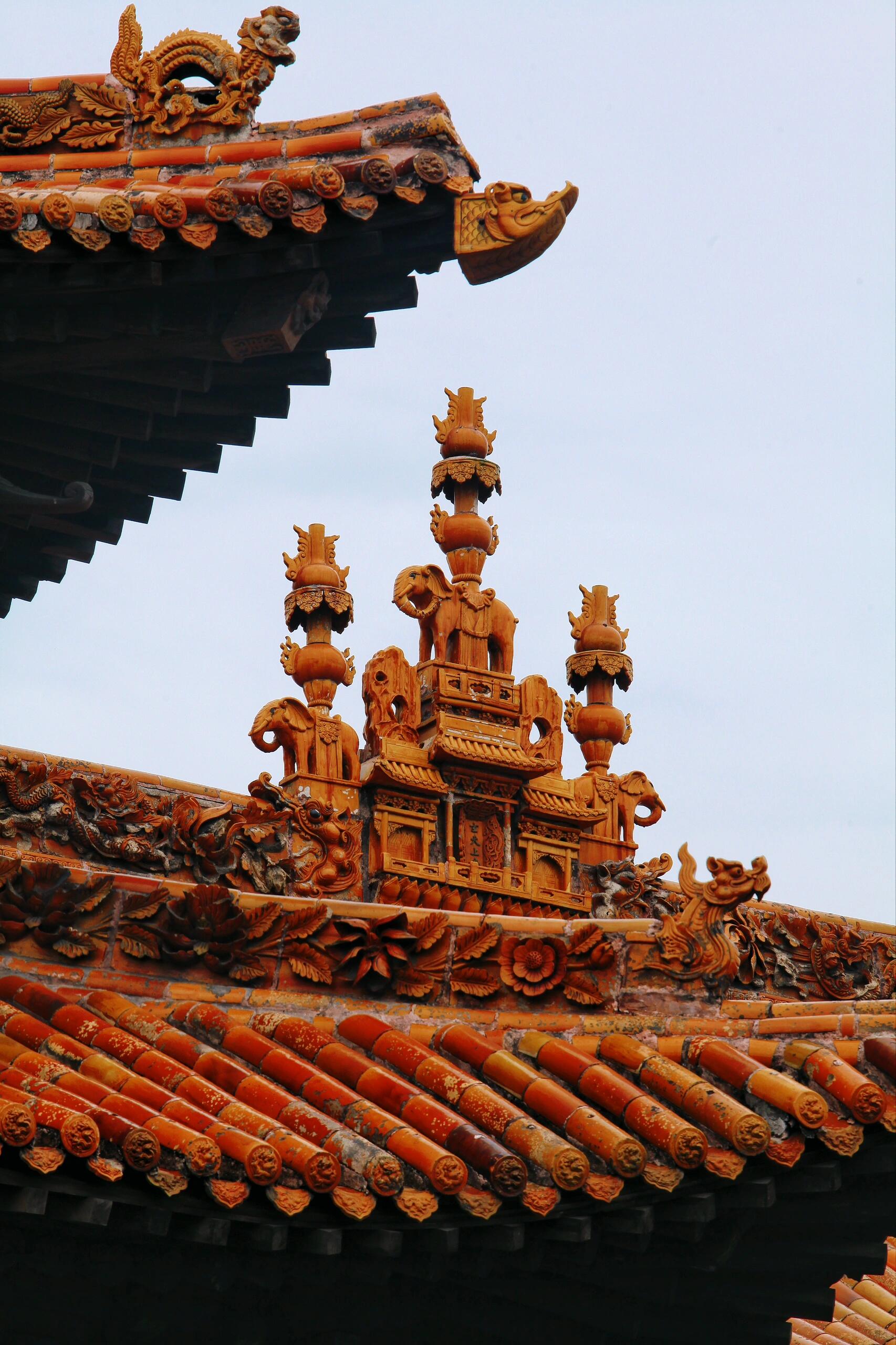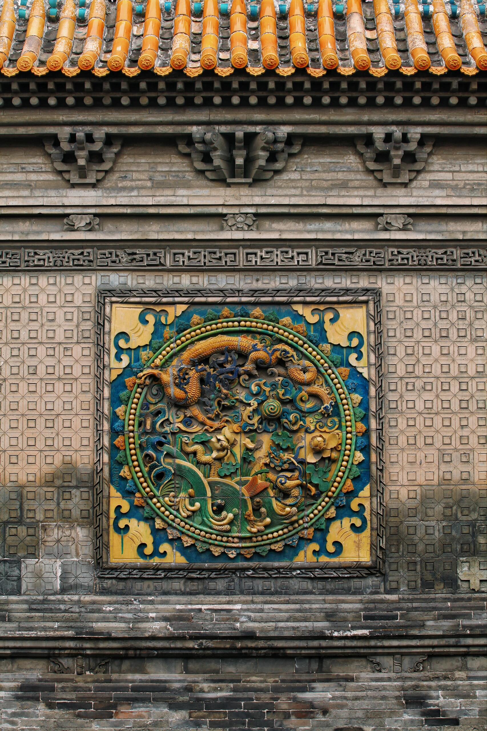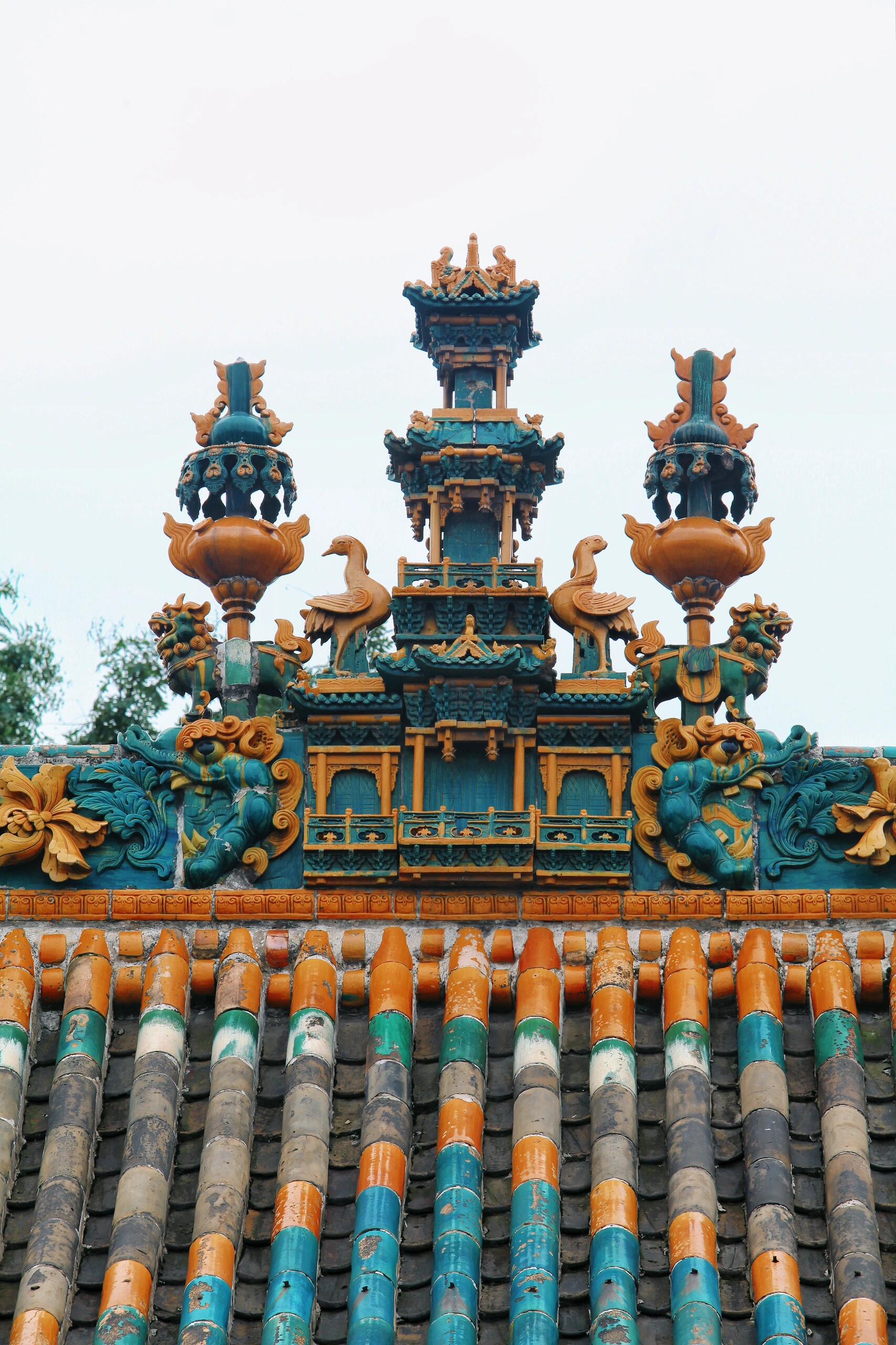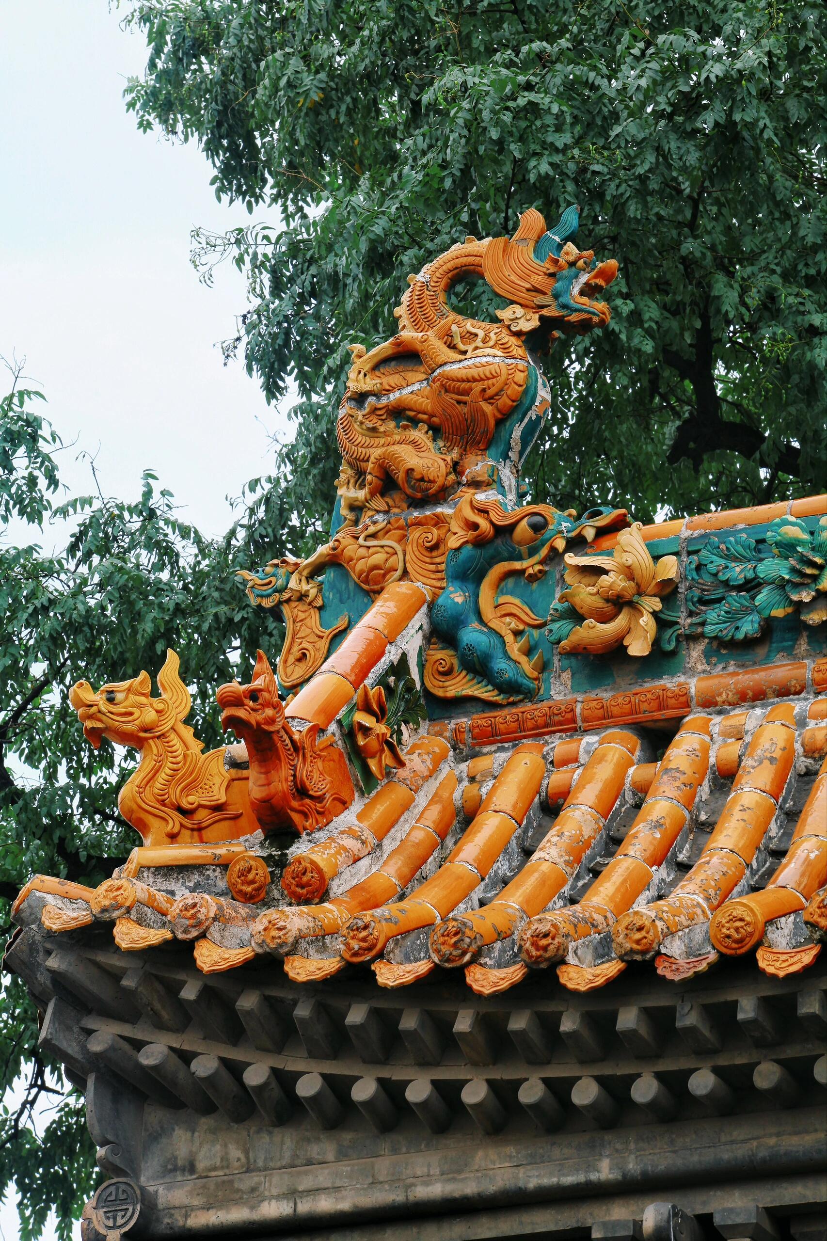 踏入后土庙,首先被震撼的是视觉的强烈冲击。主体建筑三清楼如同被琉璃包裹的艺术圣殿,整座楼顶仿佛打翻了明代的皇家色盘:黄绿二色琉璃瓦在阳光下流转出丝绸般的光泽,拼接成规整的方心几何图形,像极了古人绘制的精密星图。屋脊之上,琉璃阁高耸而立,狮瓶、吻鸱、龙凤浮雕层层叠叠,每一处细节都堪称鬼斧神工——狮鬃根根分明,龙须随风舞动,凤凰尾羽的琉璃釉色竟能呈现出渐变的虹彩。最令人叫绝的是,这些琉璃历经五百多个春秋的风吹雨打,釉面依然光洁如新,色彩饱和度甚至超越许多现代工艺品,让人不禁怀疑明代工匠是否掌握着失传的“琉璃不老术”。