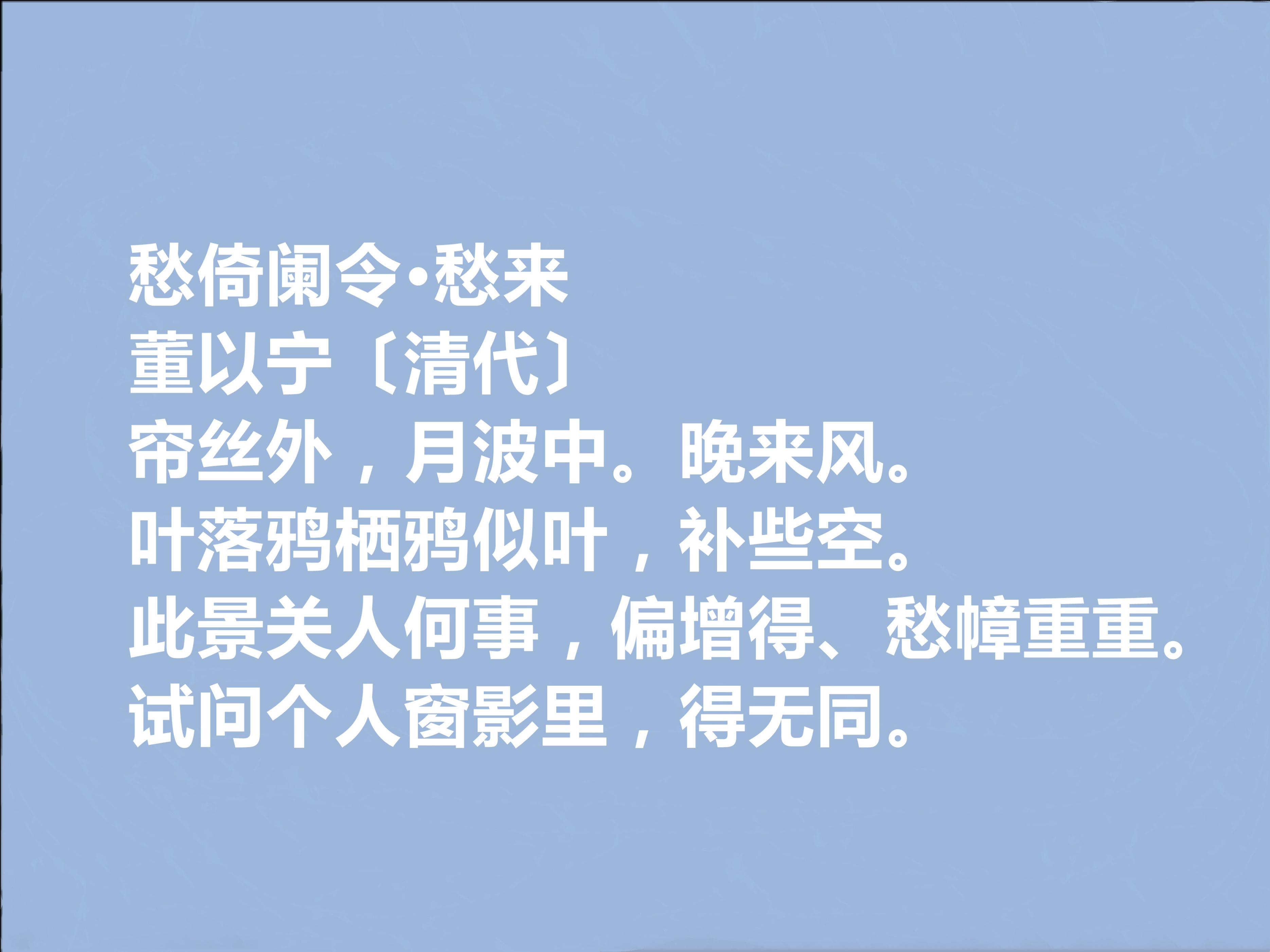 文化上,晚明公安派、竟陵派的性灵余韵未消,清初复古思潮与经世致用思想并行,词坛则在婉约传统基础上,开始融入易代的家国之思,为其创作提供了深厚的时代土壤。董以宁并无明确记载的文坛老师,其文学素养源于深厚家学与自身博览,上承南唐后主、李清照的婉约词风,旁参辛弃疾、陈子龙的豪放之气,逐步形成独树一帜的创作风格。