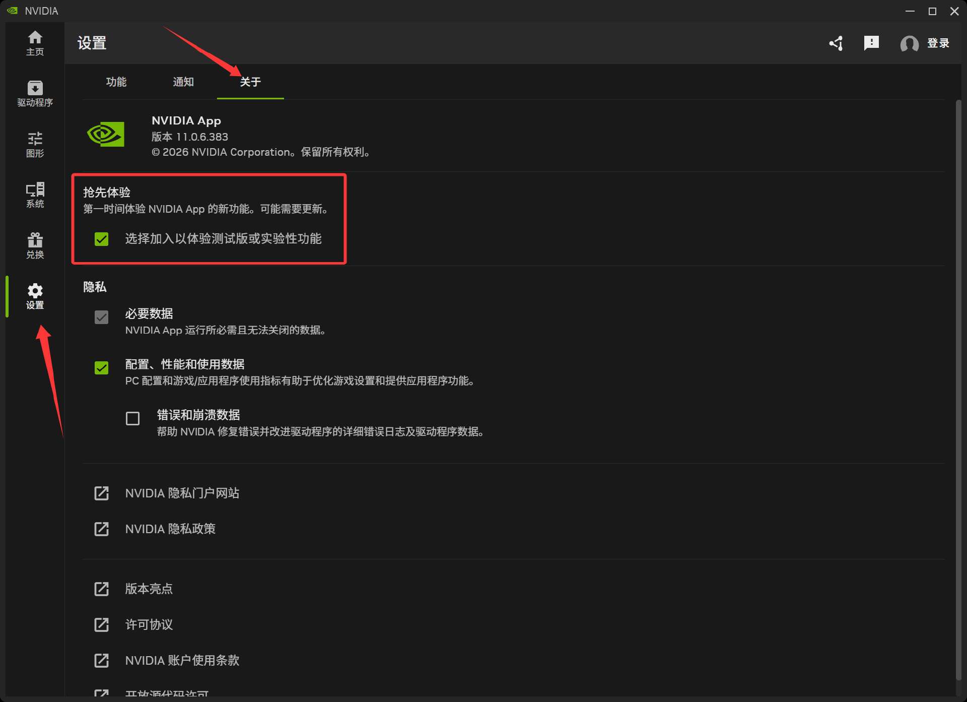 其实很简单,首先把在NVIDIA App中,点击“设置”>“关于”中的“选择加入以体验测试版或实验性功能”,安装GeForce Game Ready驱动 595.97或更高版本。