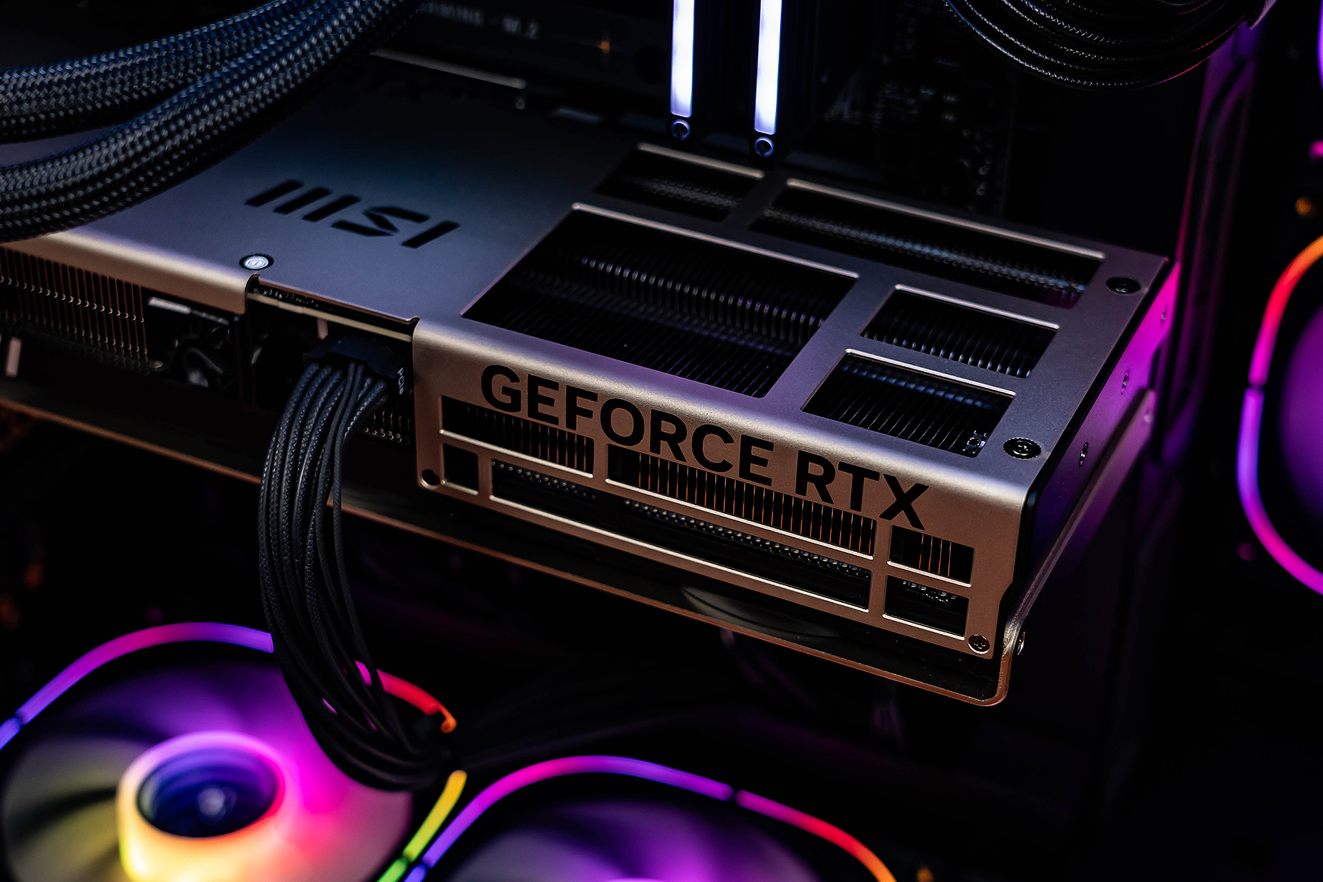 为应对高达360W功耗,微星在这张显卡上部署了精密的散热系统。PCB层面采用了11相50A DrMOS供电设计,结合2盎司增厚铜层,大幅降低了电流传输路径上的阻抗与功率损耗。独特的暴风7风扇采用带有龙爪纹理的七叶片设计,结合双滚珠轴承,大幅提升了静压与气流集中度。内部热传导则依赖镀镍铜底座、方形核心热管,以及具有V形切口与导流槽的波浪形鳍片3.0与导流鳍片,确保了高负载下的极限热交换效率。