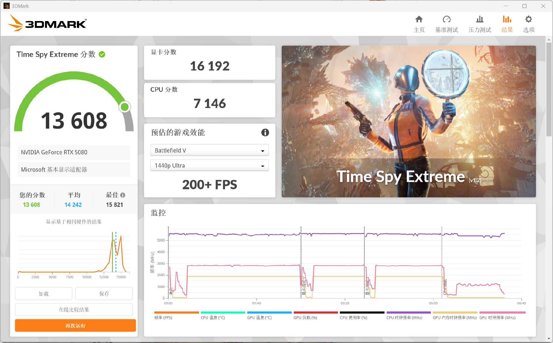 3DMARK Time Spy Extreme 是针对4K分辨率 DirectX 12 游戏的性能测试,测试结果13609分,其中微星RTX 5080硬派师OC得分16192分。