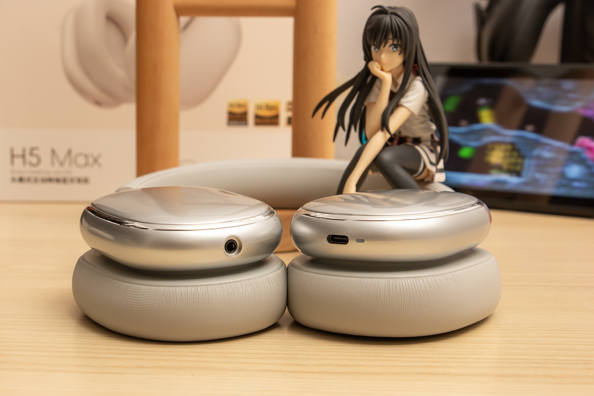 唐麦H5 Max的Type-C充电口设计在右耳底部,其内置1000mAh大容量电池,使得整机续航时间达到恐怖的150小时,完全没有电量焦虑。左耳底部设计有AUX接口,可以通过耳放或者直接接电脑的音频输出接入使用,如果有比较好的耳放或者其他功放系统,则能体验更纯粹的音质,毕竟唐麦H5 Max是Hi-Res双标认证的耳机。