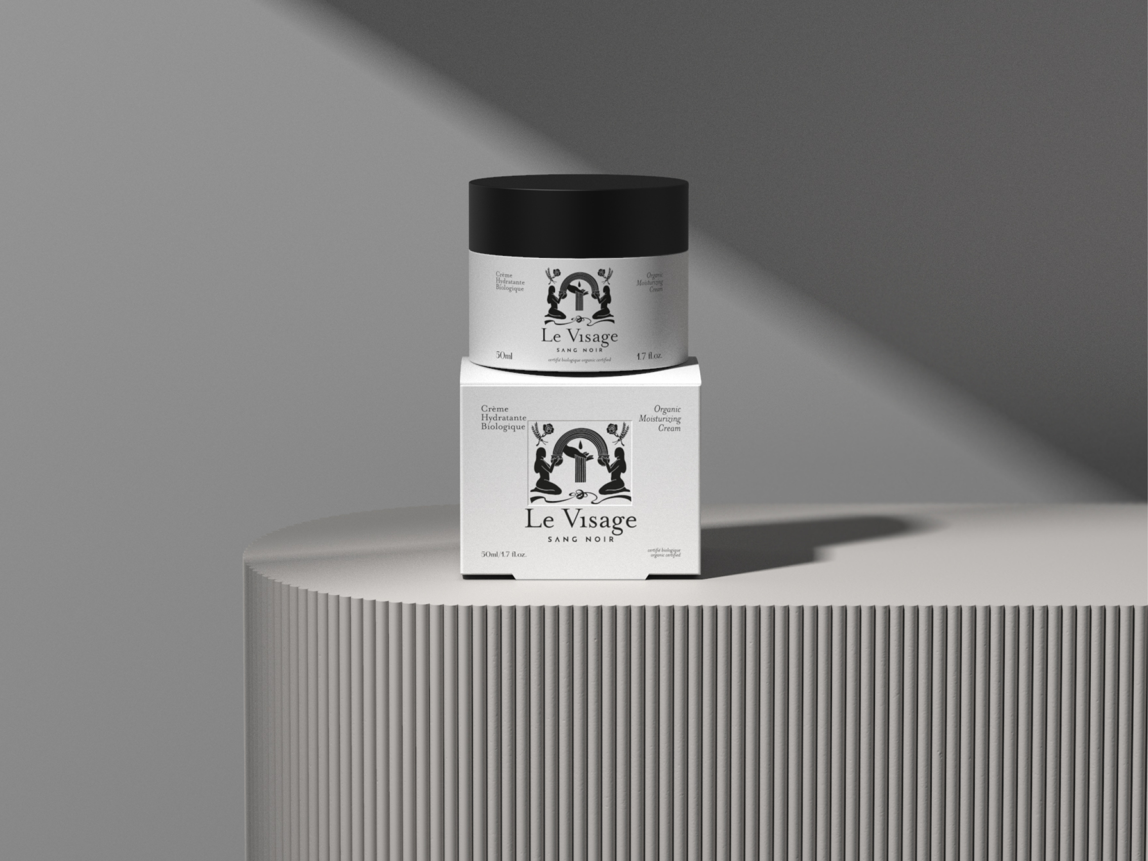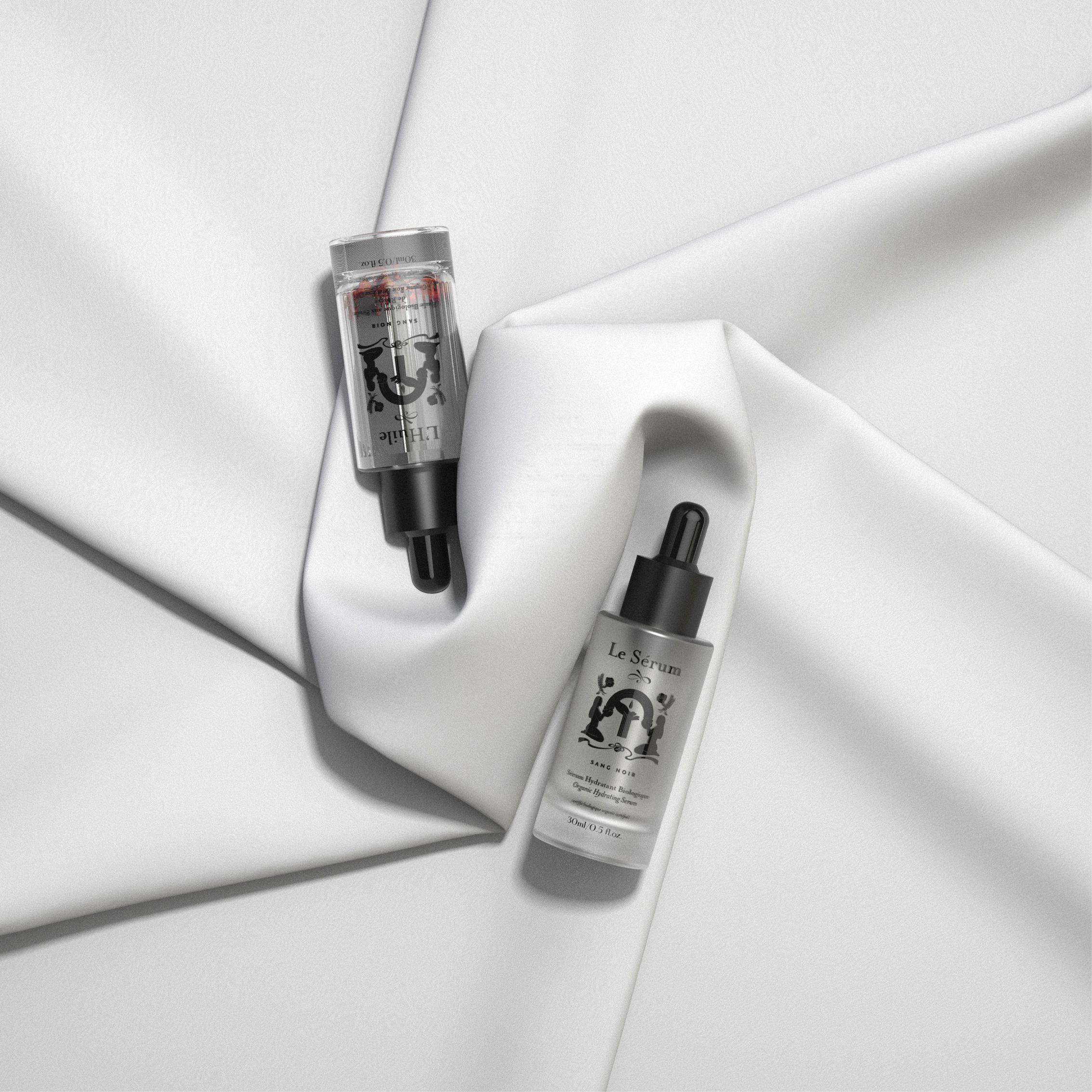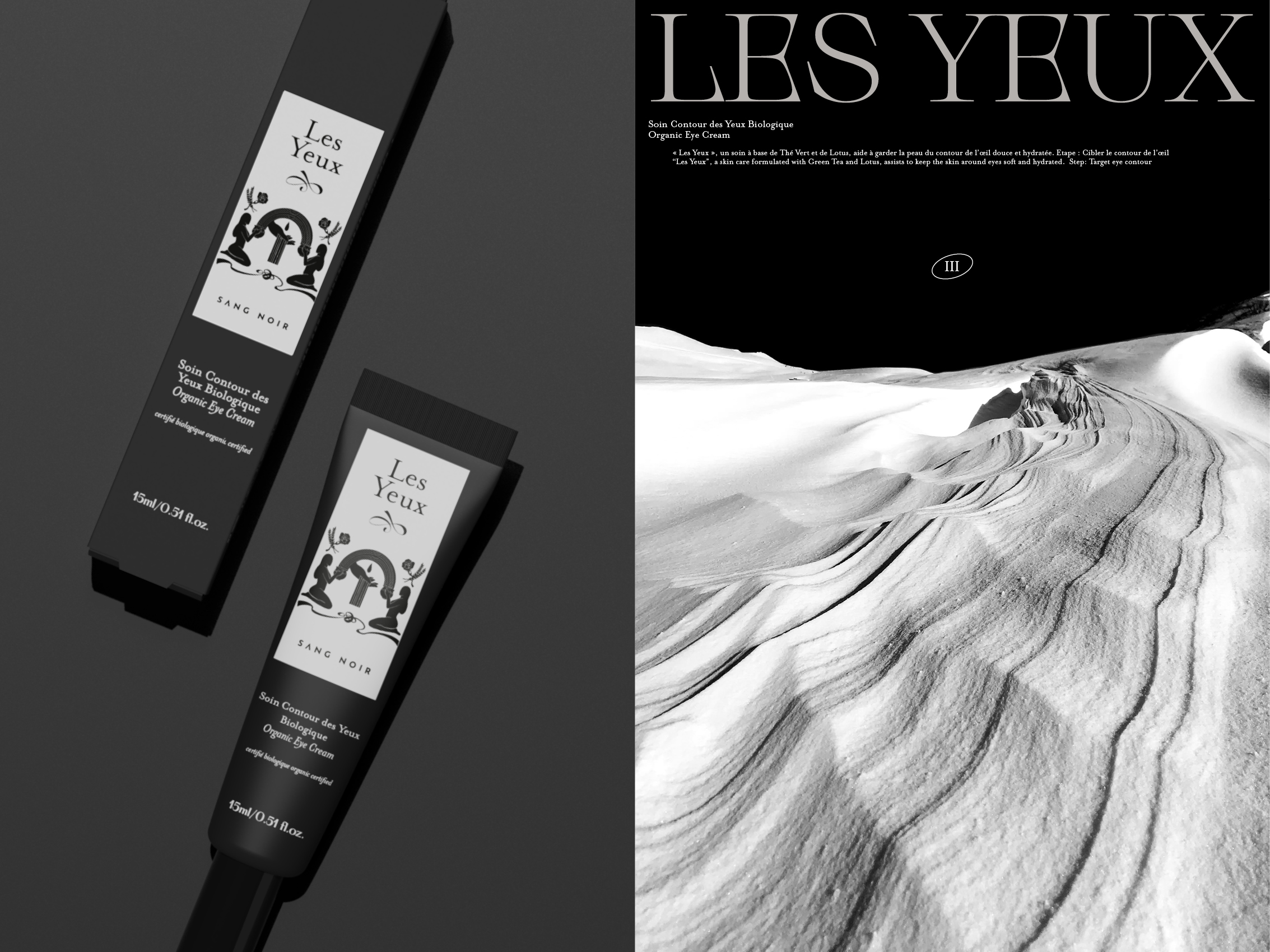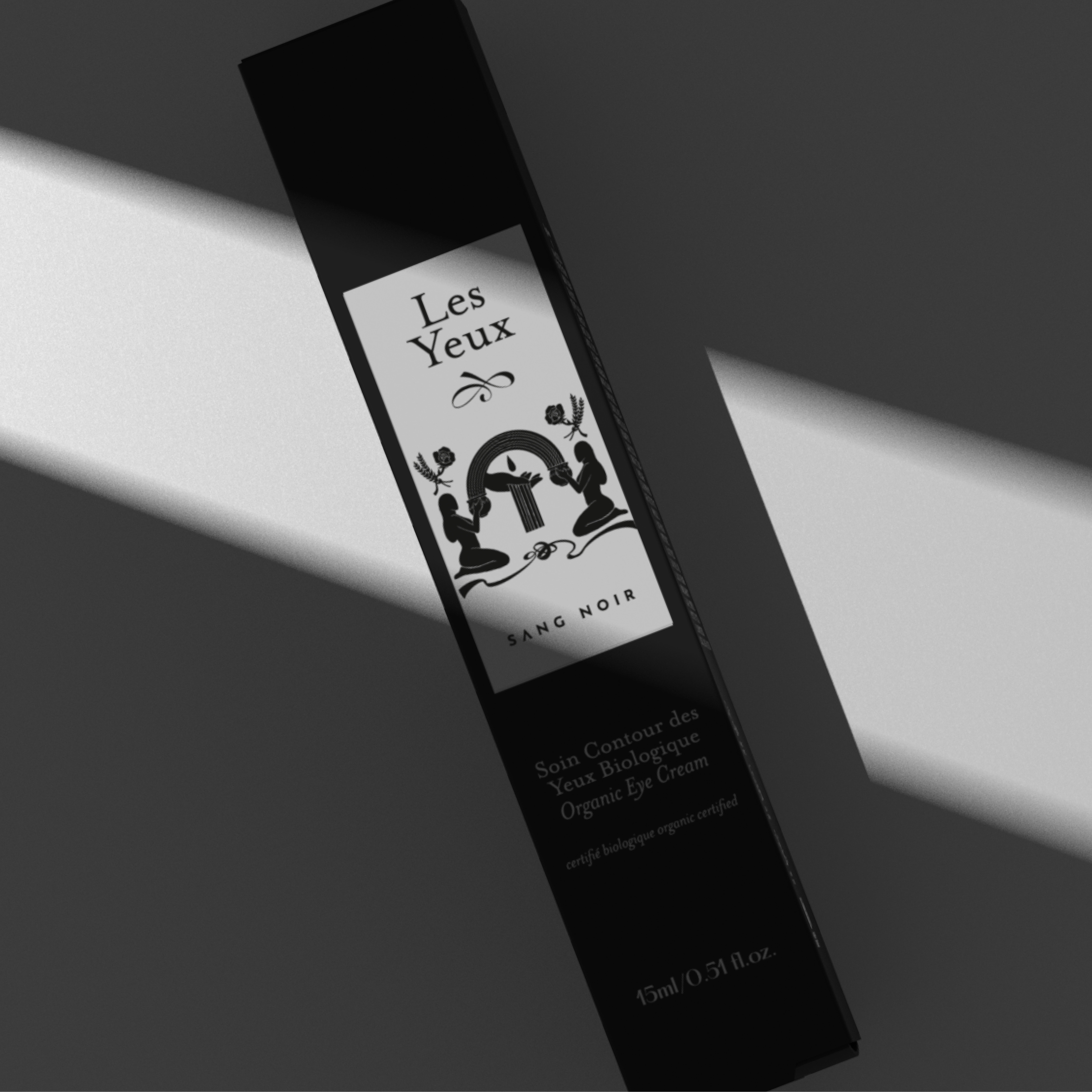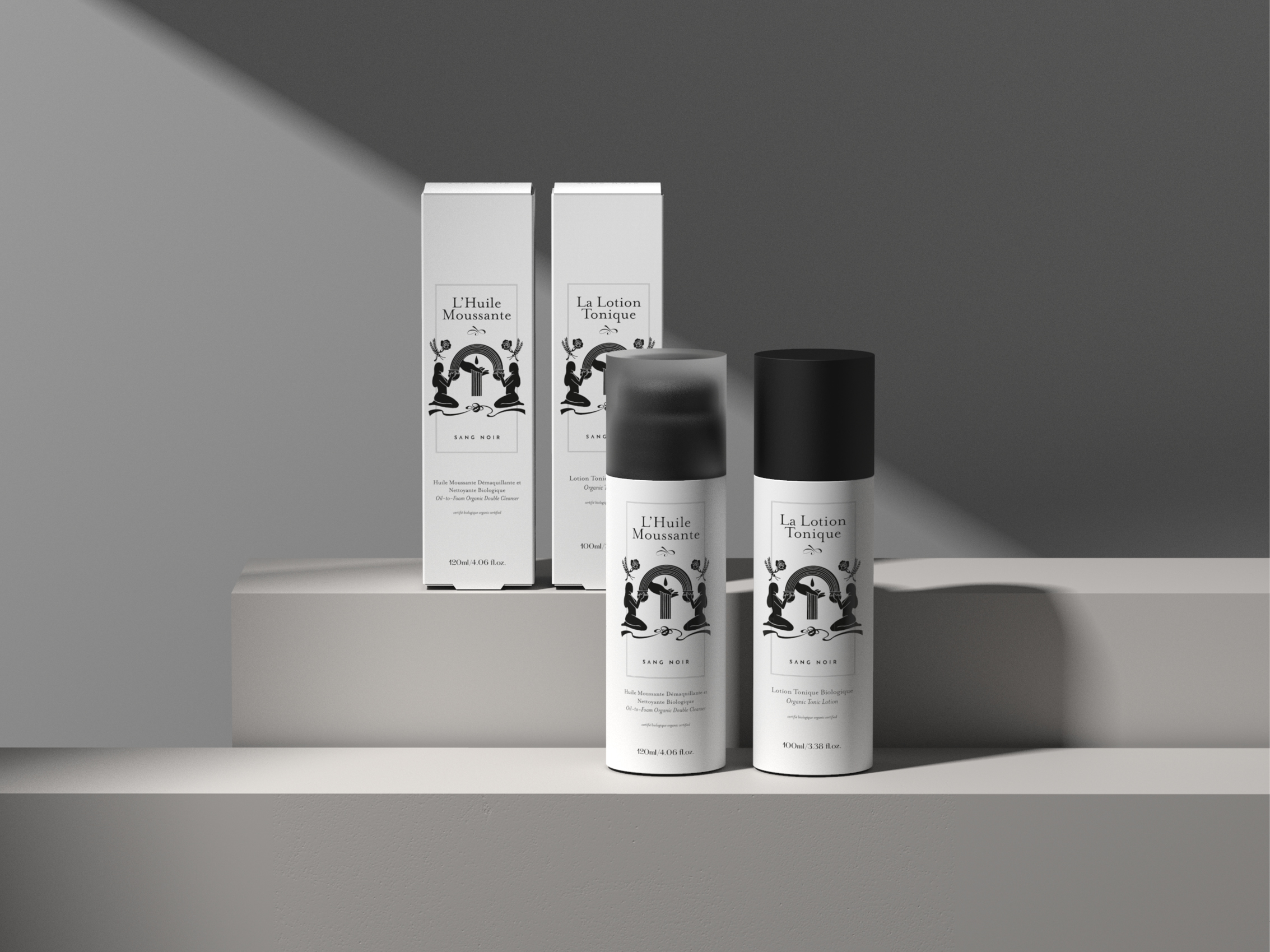 如果sage & veda是自然诗人,SANG NOIR就是暗黑哲学家。包装以黑白双色演绎极致简约,哑光材质与几何拱门图案碰撞,像教堂穹顶的抽象解构。品牌标志性的“祈祷人物剪影”与拱门组合,既似宗教壁画,又像某种神秘仪式的符号,让护肤流程瞬间变成“自我加冕”的仪式。