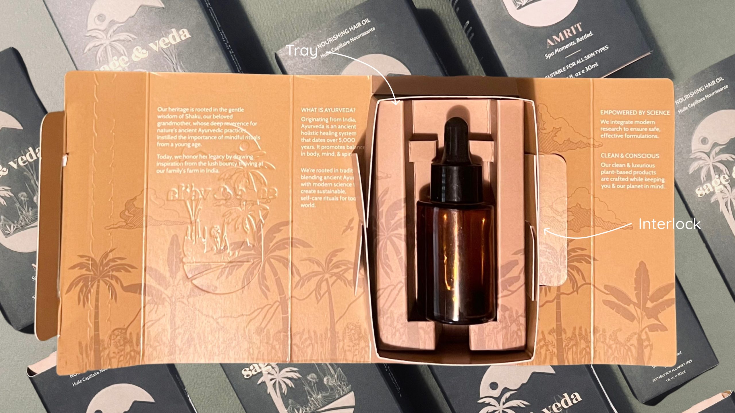 sage & veda的包装像一本翻开的自然图鉴。外盒以大地色系为基调,压印的棕榈树、月亮与热带植被图案,仿佛能听见雨林风声与海浪节拍。内部折叠盒设计暗藏玄机——掀开盒盖,植物线稿与品牌故事悄然浮现,像拆开一份来自自然的礼物,仪式感拉满。