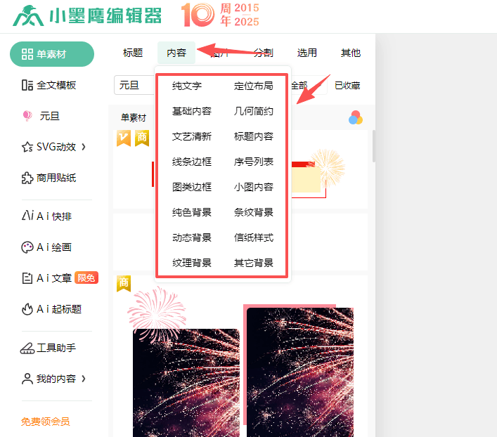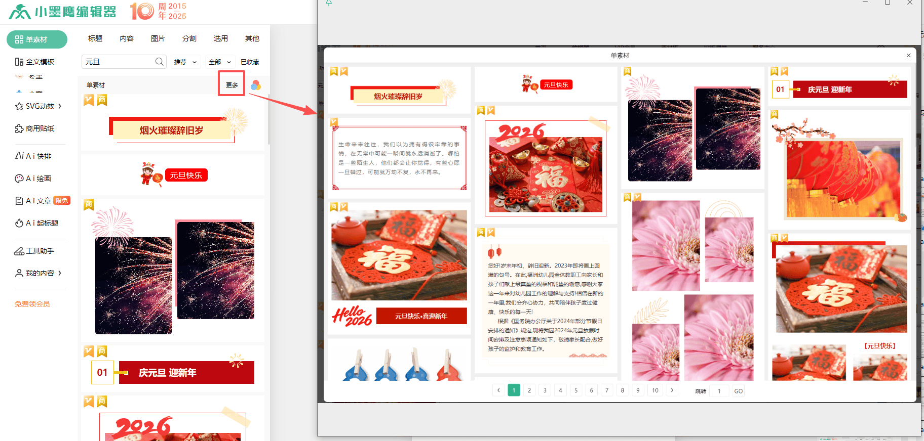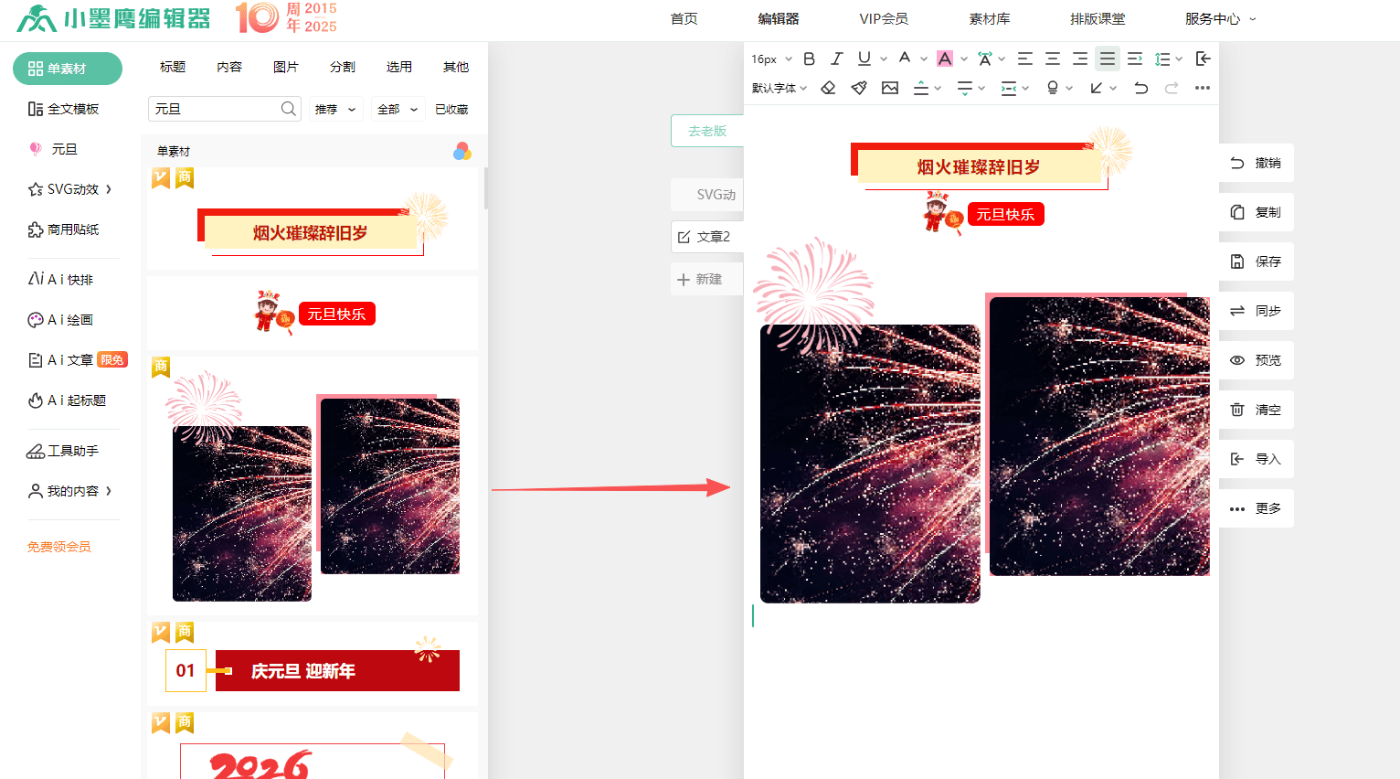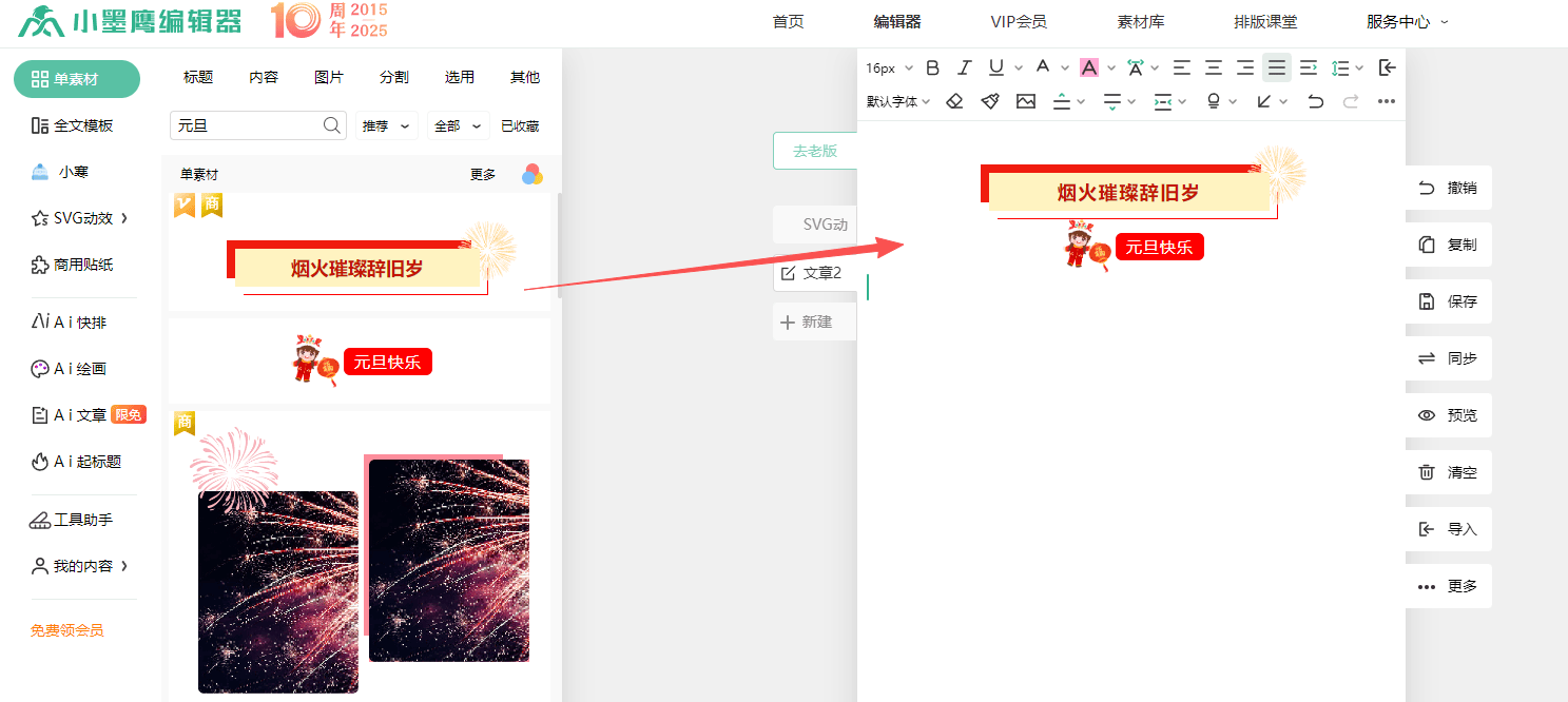 刚接触小墨鹰编辑器的朋友,可能都会对“素材库”和“编辑区域”的关系有点迷糊。尤其是看到心仪的马年元旦素材,却不知道怎么让它出现在右边的工作区里,确实挺急人的。别担心,下面我就用最详细、最直白的方式,带你走一遍整个流程,保证你看完就会。