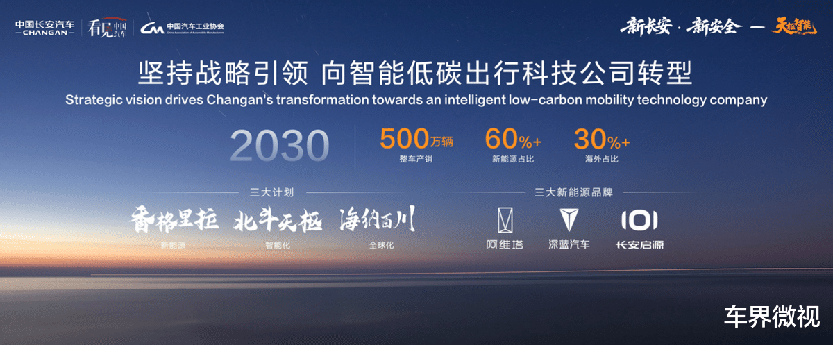 在“十四五”期间,中国长安汽车不仅快速迈上第3个1000万辆新台阶,更为面向“十五五”,助力打造制造强国、质量强国、建设现代化产业体系奠定了全新的起点。立足中国品牌汽车3000万辆全新起点,中国长安汽车发布了清晰战略蓝图:将以新能源“香格里拉”、智能化“北斗天枢”、全球化“海纳百川”三大计划为牵引,坚定向智能低碳出行科技公司转型,力争到2030年实现整车产销500万辆,其中新能源占比超60%,海外占比超30%。
