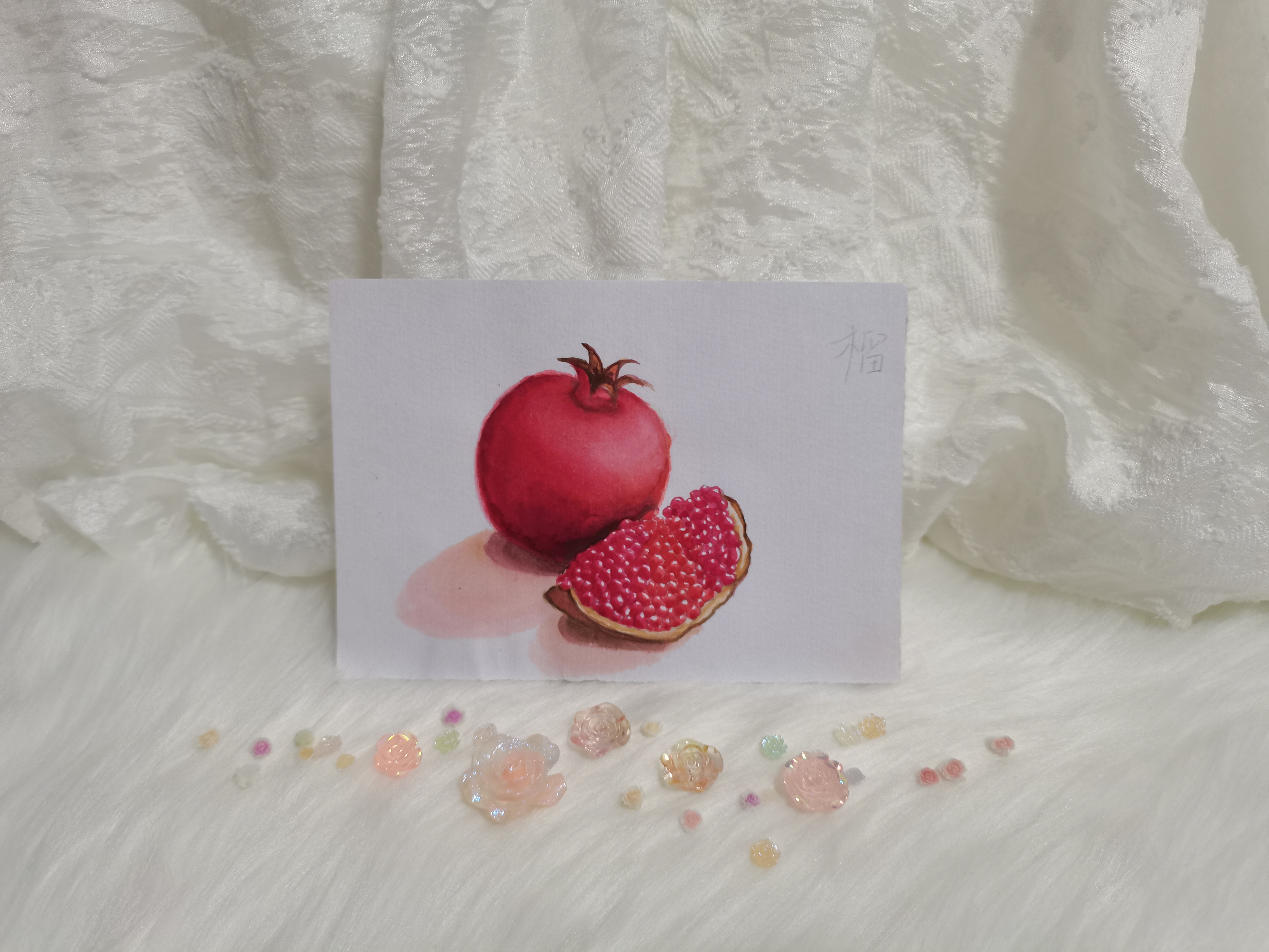 在传统绘画中有个说法,石榴籽太小,是不好的品种。不过品种什么的有什么关系呢?籽小小多多的,很可爱呢。