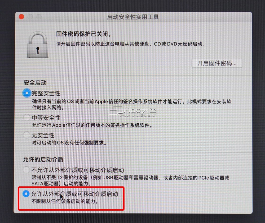 如果你的设备是配备T2安全芯片的下列设备,则需要先开启「允许从外部介质启动」,如果不是,这一步可以跳过: