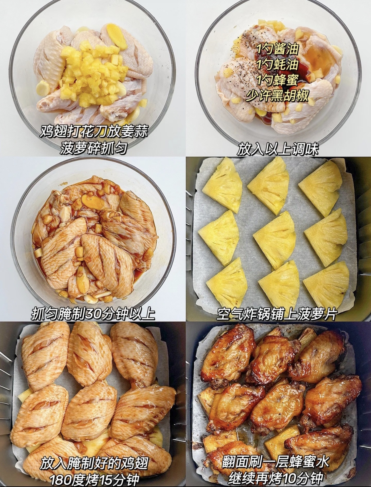 空气炸锅提前预热到180度,在炸篮里铺好油纸,先把切好的菠萝片均匀铺在底部,这一步不仅能让鸡翅在烤制时不粘底,还能让菠萝的香气随着热气慢慢渗透进鸡翅里。接着把腌制好的鸡翅整齐码在菠萝片上,注意不要叠放,保证每块鸡翅都能受热均匀。设置180度烤15分钟,中途可以打开炸锅看看状态,让鸡翅均匀受热。15分钟后取出炸篮,这时候鸡翅已经微微上色,用刷子在两面都刷上一层薄薄的蜂蜜水,这样能让鸡翅在后续烤制中形成诱人的焦脆外壳,还能增加甜味层次。刷好后放回炸锅,继续以180度烤10分钟,直到鸡翅表面变得金黄油亮,边缘微微焦脆就可以出炉了。