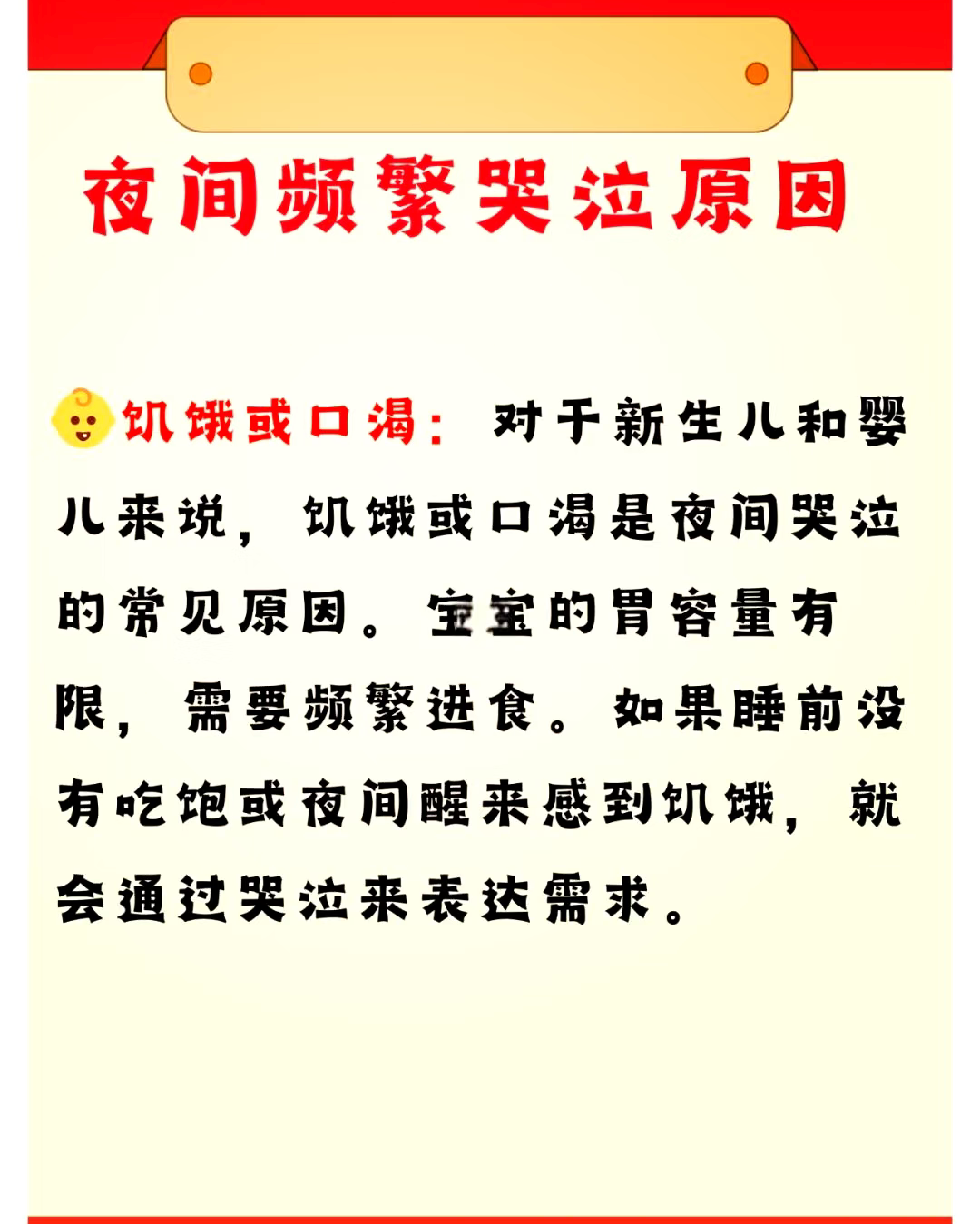 最常见的原因是饿了。小宝宝的胃就那么一点点大,跟他的小拳头差不多。喝下去的奶,一两个小时就消化完了。半夜醒来哭着找吃的,太正常了。你试着喂喂他,如果他咕咚咕咚喝得起劲,喝完就乖乖睡了,那多半就是饿醒的。