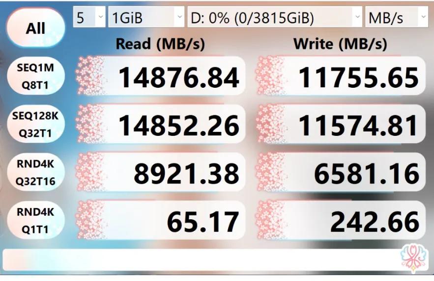 主板提供了充足的现代接口:包括一条加固型PCIe 5.0 x16插槽用于旗舰显卡,以及两条PCIe 4.0 x8插槽用于多卡或扩展卡。存储方面,两个PCIe 5.0 x4 M.2插槽和两个PCIe 4.0 M.2插槽均覆盖有散热装甲,且采用了便捷的快易拆设计。其中,位于最上方的PCIe 5.0 M.2插槽在实测中,搭配旗舰级Gen5 SSD实现了超过14800 MB/s的顺序读取速度,完全释放了新一代存储设备的性能潜力。