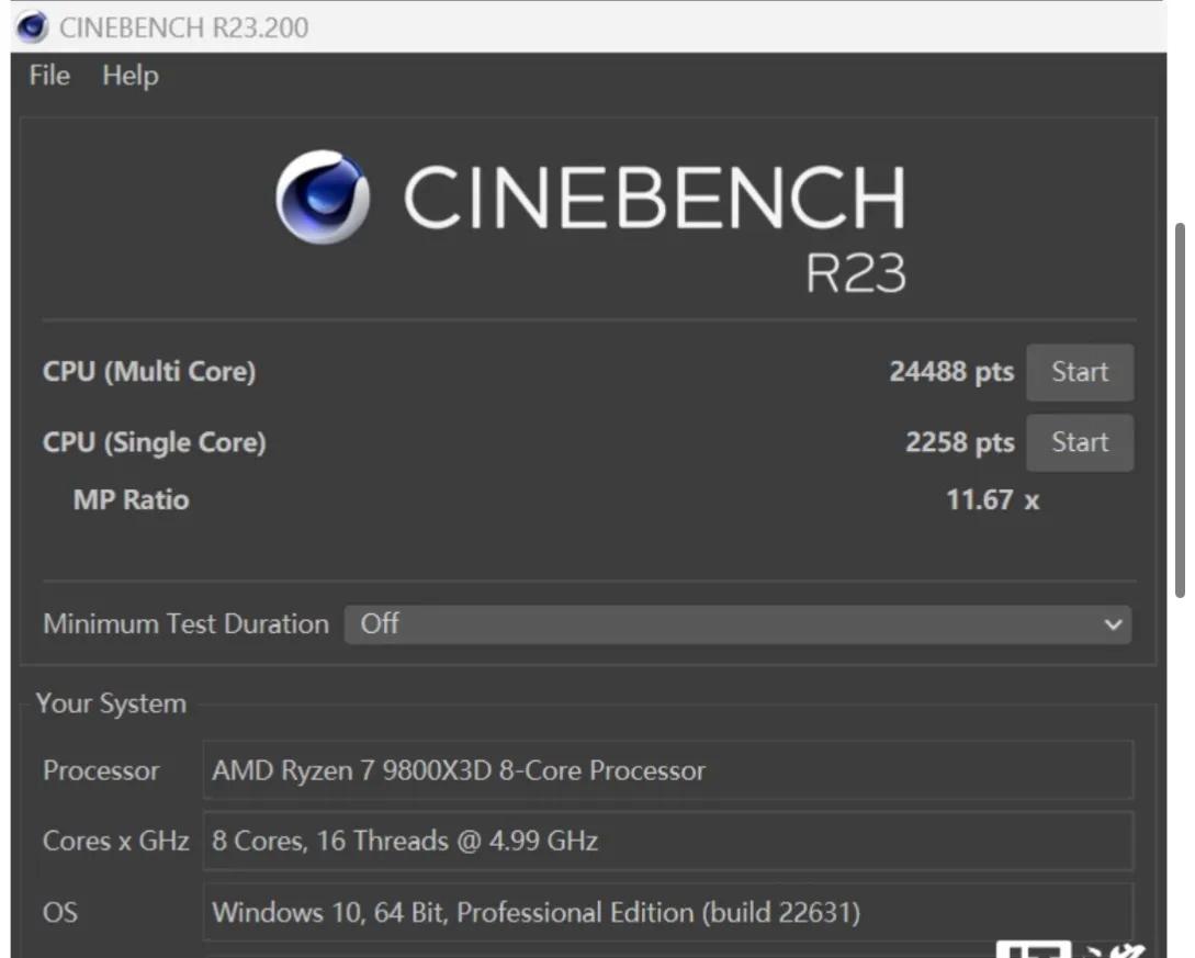 核心性能测试环节,我们重点考察了其独有的“X3D鸡血模式2.0”。该功能在BIOS中提供了“标准”、“最大性能”和“极限游戏”三种预设。在“最大性能”模式下,锐龙7 9800X3D在Cinebench R23中的多线程得分从标准模式的23484提升至24488,提升幅度约4.2%;在V-Ray 6.0渲染测试中,也提升了约5.2%。这表明该模式能有效挖掘处理器在生产力应用中的额外性能。