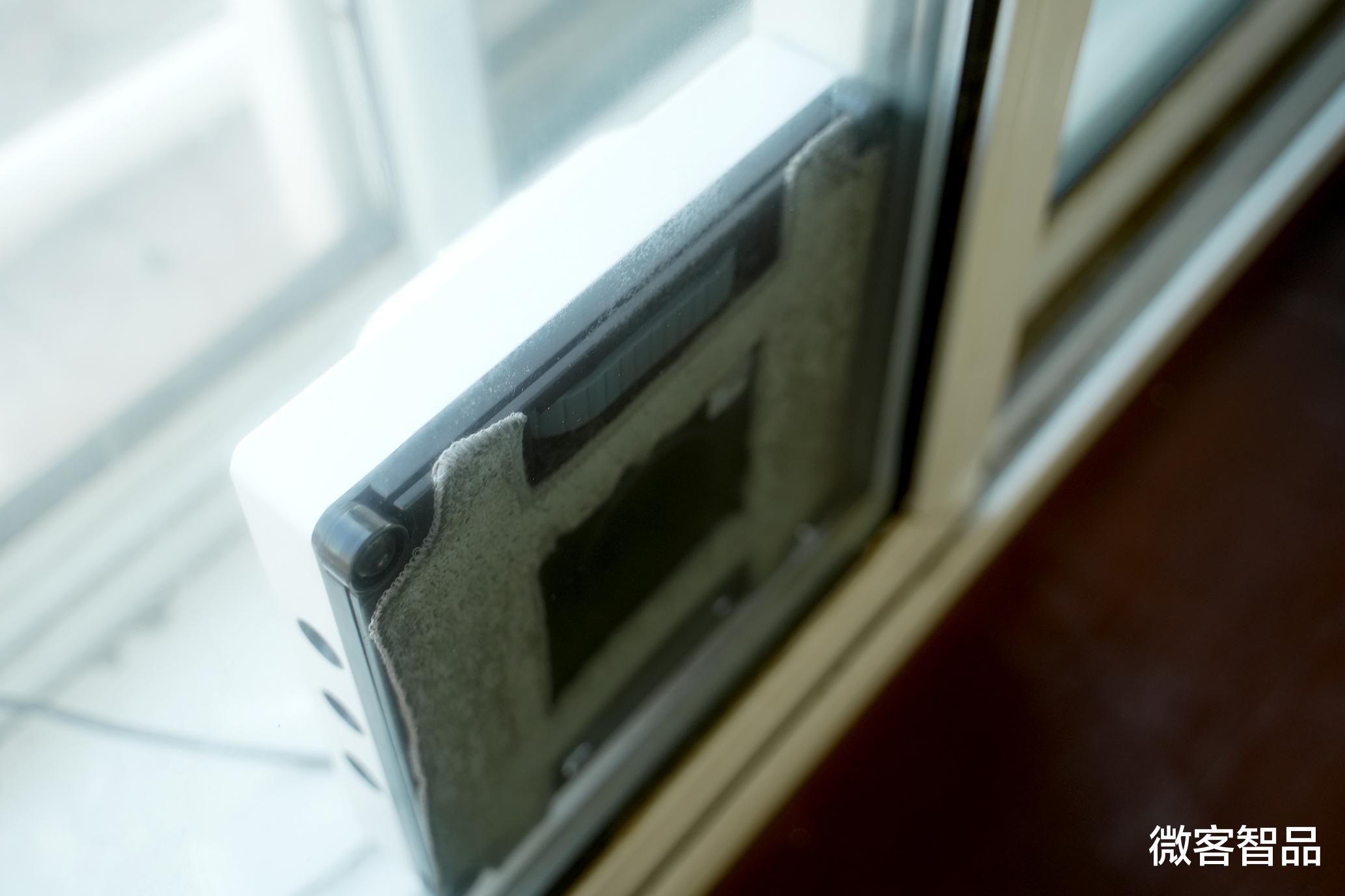 先擦的是厨房那扇沾了油烟渍的玻璃 —— 以前自己擦,用了洗洁精也擦不干净,还留水痕。这次我往水箱加了水,安装擦布,把机器贴在玻璃上,按一下启动键,它就自己动起来了。肉眼能看到它先喷了层细雾,不是那种哗啦啦的流水,而是特别均匀的纳米水雾,后来才知道这是六喷头纳米矩阵雾化,比双喷头覆盖效率高 300%,边角都能喷到。