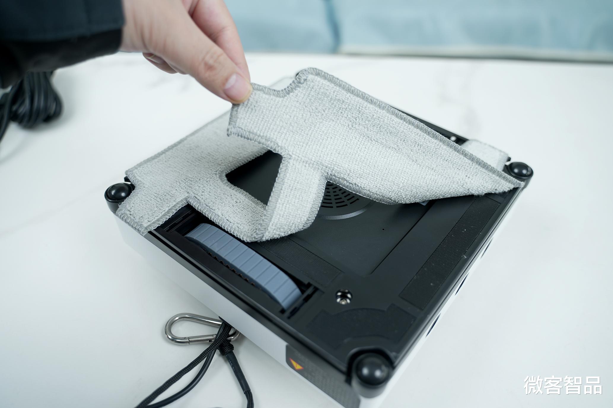 配件也特别全,除了主机,还有一根 4.5 米长的登山级安全绳,摸着手感就很结实,后来看介绍才知道能承重 150 公斤,安全感直接拉满;还有全功能遥控器,采用了2.4G无线技术,可360度全方位和8米远距离无阻挡操控。遥控按钮不多,老人看一眼也会用;两个 NanoTex 纳米疏水清洁布,用魔术搭扣粘在机身上,拆下来洗也方便;另外送了个小注水瓶,往水箱加水的时候不会洒,细节做得特别贴心。