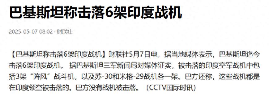 印巴还是开打了!战况十分激烈,巴基斯坦甚至称已经击落了6架印军战机!5月7日巴基斯坦三军情报局对当地媒体证实,已经击落了以军最新的“阵风”战斗机,而且还是3架!另外还有苏-30和米格-29各一架被击落,剩下的一架应该是无人机。根据美国有线电视新闻网5月7日稍早报道称,巴基斯坦高级情报人士对美媒透露,是有3架印度军机以及一架无人机被击落,击落范围是在“印度控制区内”。而在当天最初的消息是,巴基斯坦方面确认是击落2架印军战机。很显然,战况发展速度远远超过了预期,印巴之间发生了大规模空战!