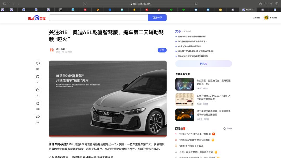 比普通版贵出2-5万买的“智驾版”,第二天就成了摆设。讽刺的是,这可是一汽奥迪大力宣传的:“全球首款搭载华为乾崑智驾技术的燃油车”“开创燃油车智能先河”的豪华轿车。