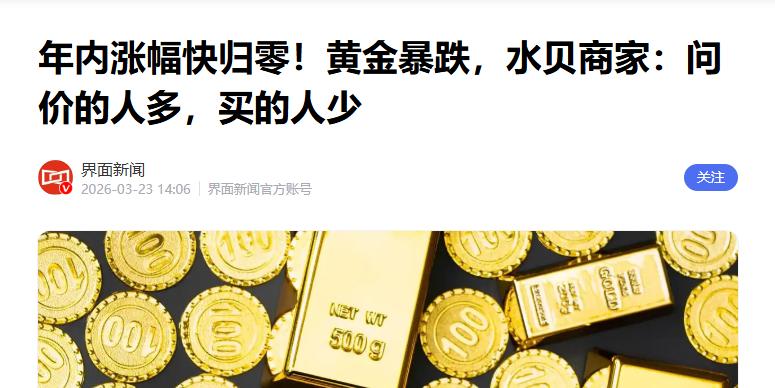 年内涨幅快归零!黄金暴跌,水贝商家:问价的人多,买的人少 界面新闻 2026-03-23 14:06界面新闻官方账号