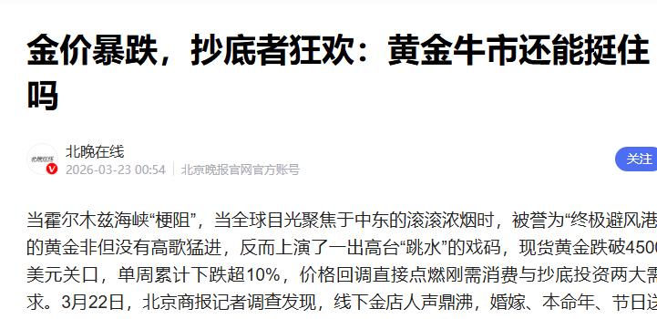 金价暴跌,抄底者狂欢:黄金牛市还能挺住吗 北晚在线 2026-03-23 00:54北京晚报官网官方账号