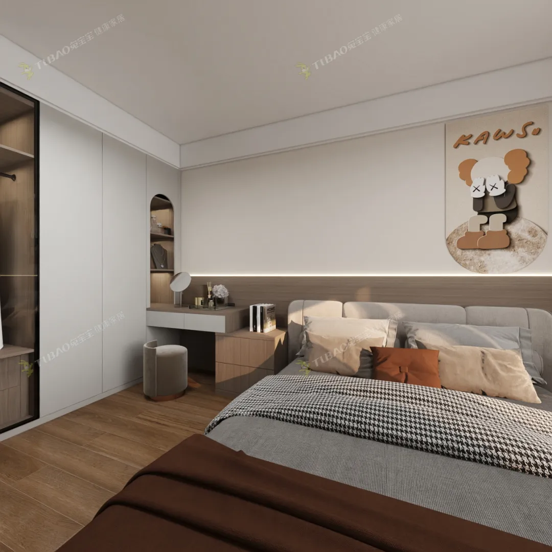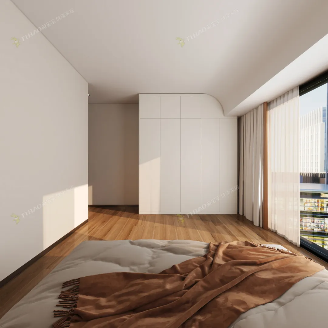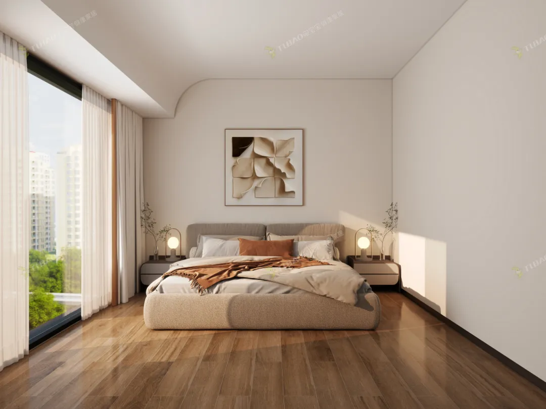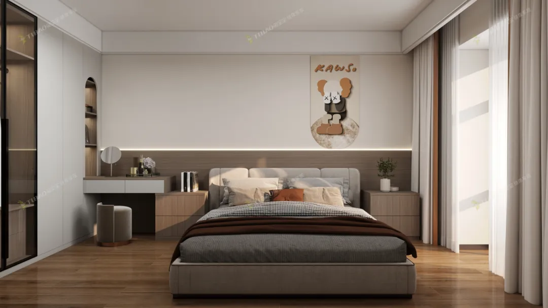 卧室是休息与放松的区域,设计同样遵循简约原则。白色为主调的墙面,搭配原木色的床头柜和灰色的床品,营造出一种宁静而深邃的睡眠环境。床头背景墙采用一幅简约风格的挂画,既提升了空间的艺术感,又不过于张扬。将梳妆台和衣柜结合,从色彩到细节都更贴近整体空间风格,带来简洁美观的视觉效果。化妆更衣一步搞定,极短的动线提高卧室空间的效率和舒适度。