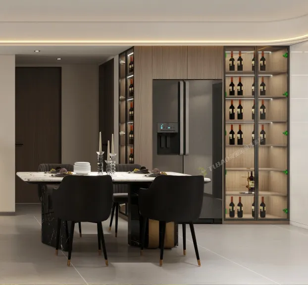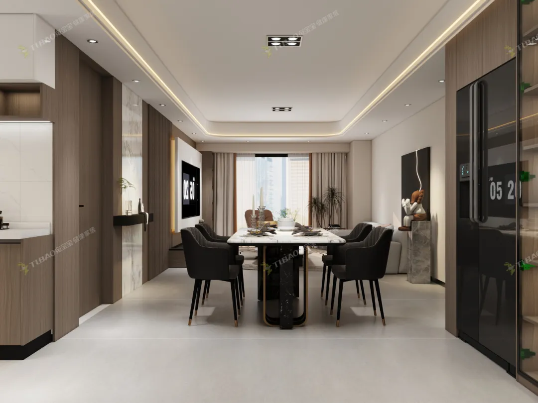 餐厅区域紧邻客厅,通过一张黑色的长方形餐桌和几把线条流畅的餐椅,营造出温馨的就餐氛围。餐桌上的烛台与餐具摆放,细节之处尽显主人的生活情趣。顶部一盏简约风格的灯,为用餐时光增添了几分温馨。餐边柜+冰箱内嵌酒柜的设计,使其整体感更加强烈。