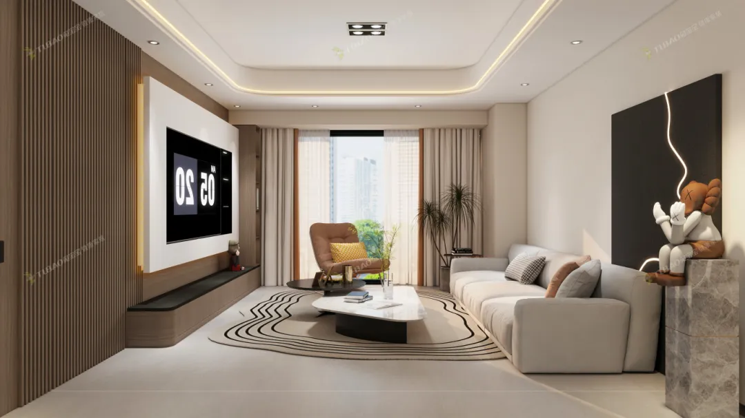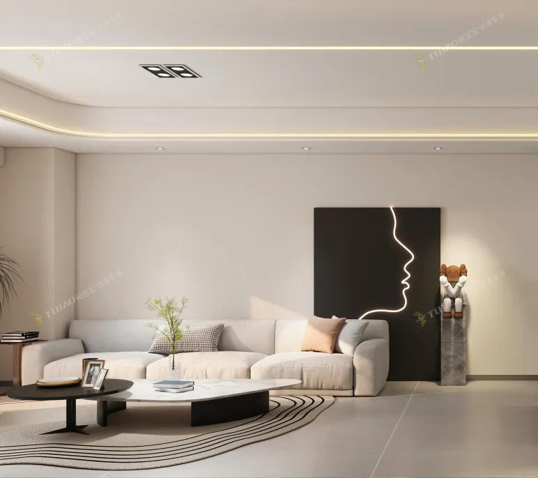步入客厅,首先映入眼帘的是宽敞明亮的开放式布局。大面积的落地窗引入自然光,与纯白的墙面、天花板相映成趣,使得空间显得更加通透与开阔。一组简约风格的布艺沙发,搭配异形大理石的茶几,既保留了舒适的坐感,又不失现代感。一幅画作为客厅沙发背景墙的装饰,能够呈现出简约、大方的空间感,同时,也能突显主人的品位和艺术修养。电视背景墙采用极简设计,一块大屏幕嵌入其中,周围留白,简洁而不失格调。L型电视柜设计是将竖向通顶储物柜与横向一字柜结合搭配,增加了客厅的储物空间。