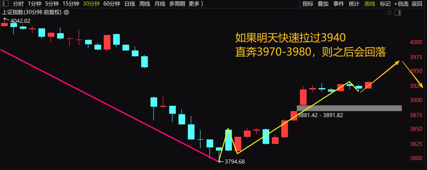 第一种,也是概率相对较高的,是探底上涨的走势。今天的盘面走势,和去年4月10日的行情高度相似,那明天的走势,就可以参考去年4月11日的行情,也就是探底之后再拉升上涨。从30分钟K线的浪形来看,本质上就是半个回调浪+半个新的上涨浪,明天大盘大概率平开,早盘高点会摸到3940点下方,之后震荡走出一个W底,午后再发力拉升。