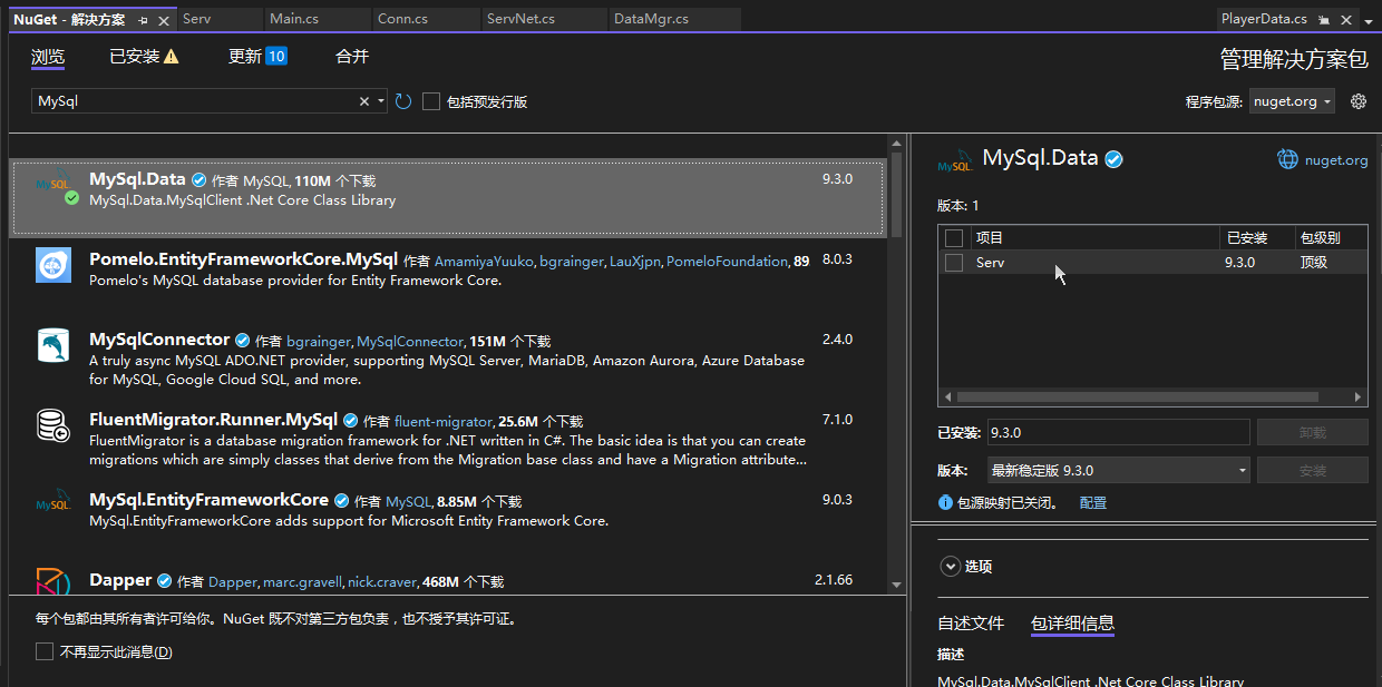 由于我的项目是一个别人写的游戏后台服务,里面有 MySql.Data 的依赖,所以在运行代码前需要先安装。这里有个小 Tips,就是对依赖安装位置的修改,如果不修改,以后下载的都在 C 盘了。