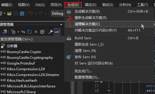 如果在引用中没有看到安装的包,或者有感叹号,可以对项目进行清理。点击菜单下 生成 -> 清理解决方案,然后再 ” 重新生成解决方案 “。