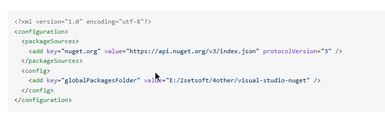 1. 修改依赖位置打开 visual studio,工具 ->NuGet 包管理器 -> 程序包管理器设置 ->NuGet 包管理器 -> 配置文件,然后打开三个文件中的 NuGet.Config,添加下面代码(注. globalPackagesFolder 位置)。