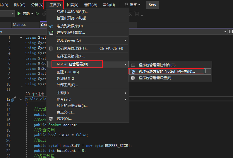 继续从工具里找到 ” 管理解决方案的 NuGet 程序包 “。