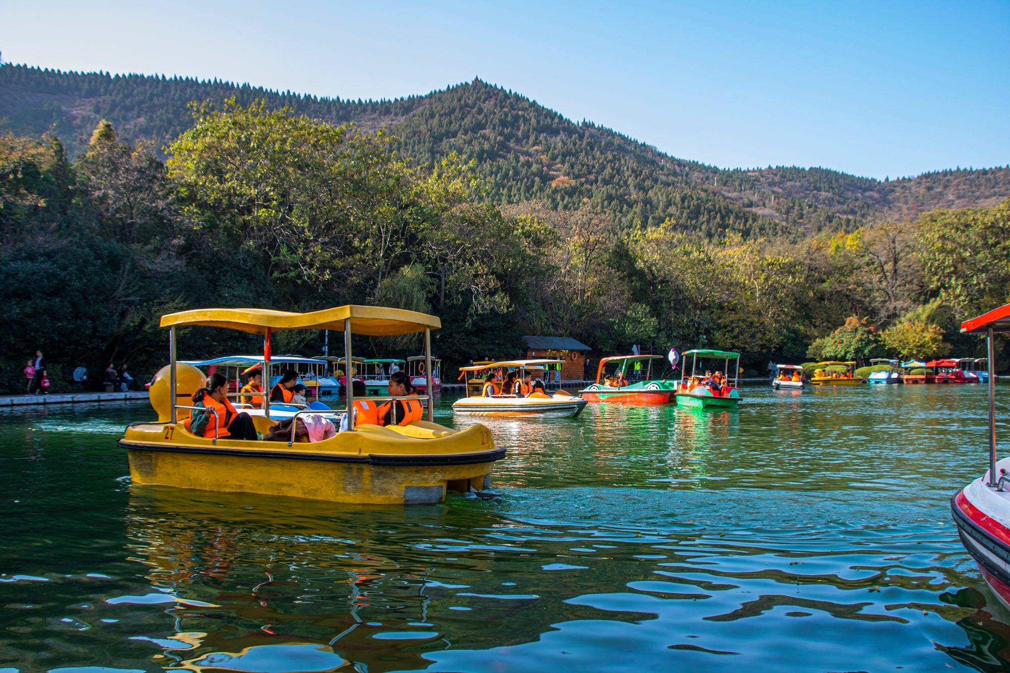 乘船游湖,两岸秋景尽收眼底,船划过水面的声音,风吹动树林的声音和婉转鸟鸣交织在一起,令人心旷神怡。