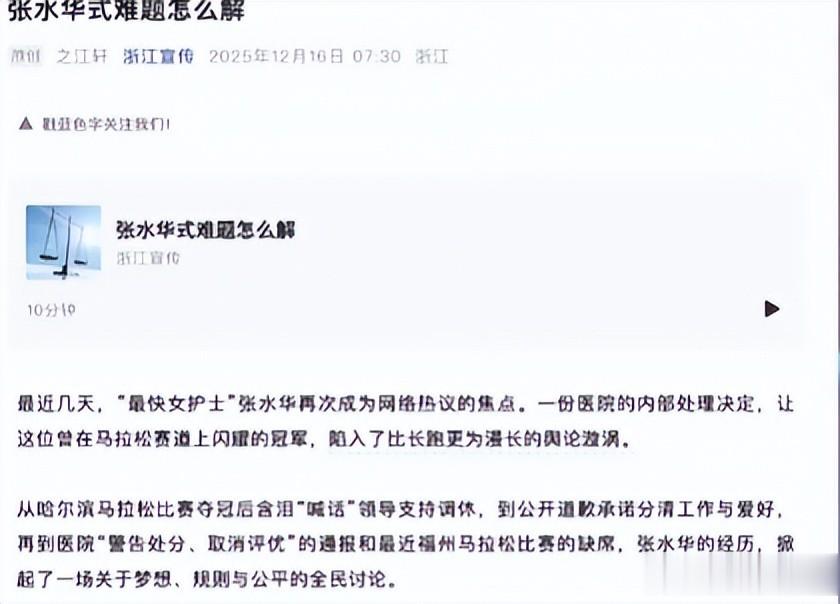 更尖锐的批评来自浙江宣传。12月16日,一篇题为《张水华式难题怎么解》的文章直言:“在赛场上,谁跑得快,谁就是冠军,但在职场中,公平才是王道。”