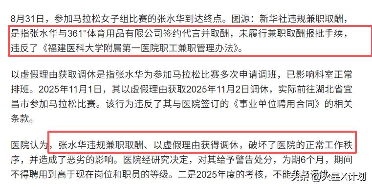 12月9日晚,一份医院内部通报在跑友圈流传,文件指出张水华存在违规兼职取酬(与361°体育用品有限公司签约代言并取酬未履行报批手续),以及以虚假理由获取调休的行为。