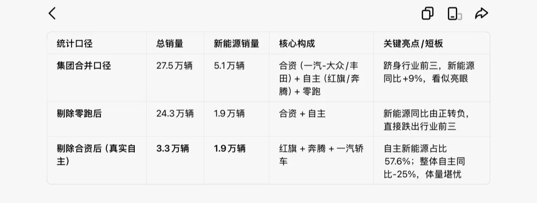 作为体量稳居榜首的中国一汽,1月以27.5万辆的总销量收官,同比微降3%,看似平稳的走势下,藏着板块发展的严重失衡。合资板块始终是一汽最稳固的压舱石,剔除零跑销量后,一汽-大众12.8万辆、一汽丰田6.5万辆,合计19.3万辆的成绩,占据了集团核心销量的79.4%,凭借成熟的产品矩阵与市场口碑,稳稳托住了集团整体销量。反观自主板块,红旗、奔腾、解放三大品牌合力仅拿下3.3万辆,同比出现大幅下滑,其中红旗作为自主高端主力,销量3.1万辆,同比下滑12.3%,奔腾与解放的表现更是不尽如人意。新能源板块虽以5.1万辆实现9%的同比增长,却严重依赖外部助力,零跑汽车并表贡献3.2万辆,占比高达62.7%,一汽自主新能源仅1.9万辆,同比依旧处于下滑区间。合资独大、自主乏力、新能源靠外援,成为一汽本月最鲜明的标签。