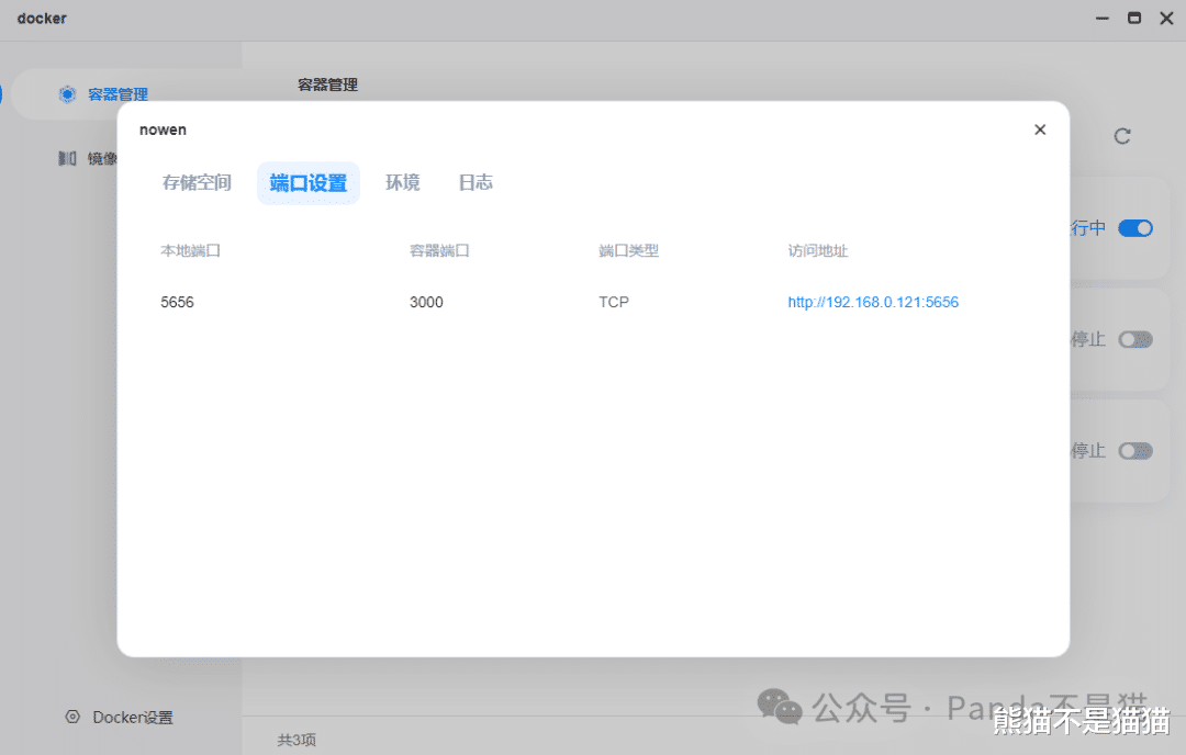 最后点击完成启动容器,通过容器管理中点击容器详情,在端口设置这里就能看到快捷访问地址了。