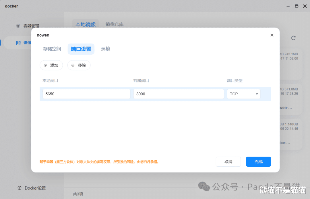 在端口设置这里,需要映射端口3000,端口类型选择TCP,本地端口随意,不冲突即可。