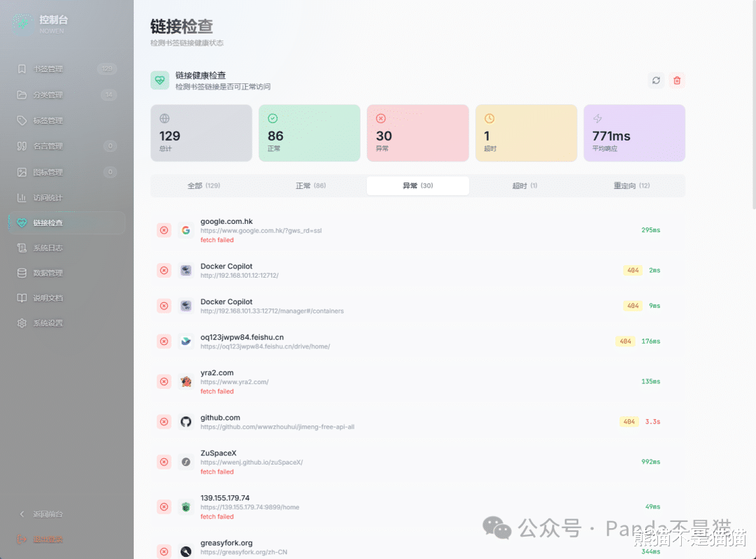 来到后台设置界面,书签管理、分类管理等等都有,这些属于常规了。比较好的是星云门户是支持多用户的,所以这里还提供了访问统计和链接检查这样的服务。