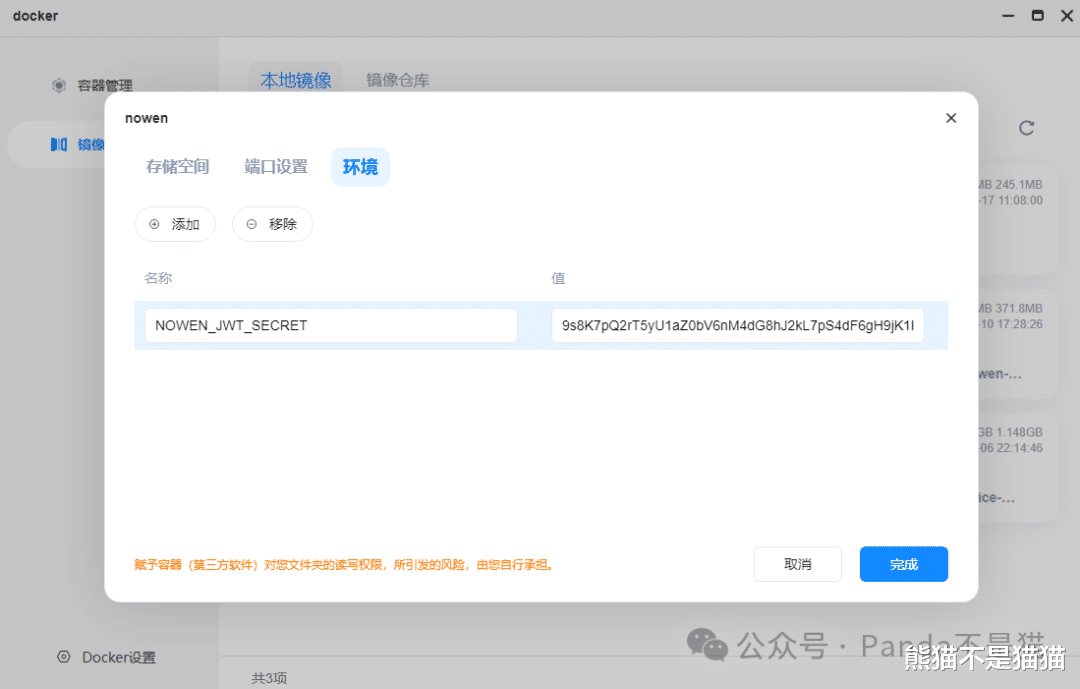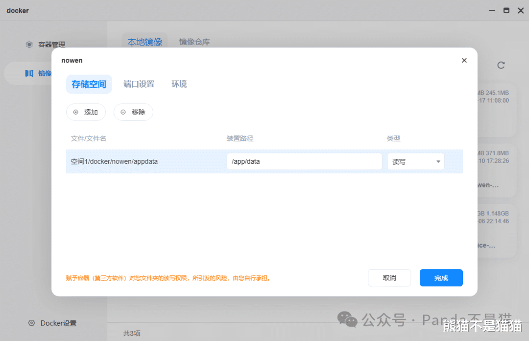 上传之后点击创建容器,取好名称之后在存储空间这里我们需要映射/app/data,用来存放项目数据文件,类型记得选择读写。