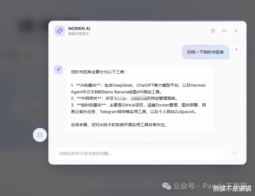 开启AI之后在首页就可以利用AI来帮我们整理书签分类、总结以及让他直接给我们一些书签添加建议等等。