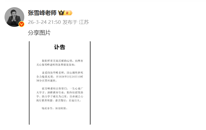 2026年3月24日,一则消息让无数人破防:知名教育从业者张雪峰,因心源性猝死猝然离世,年仅41岁。