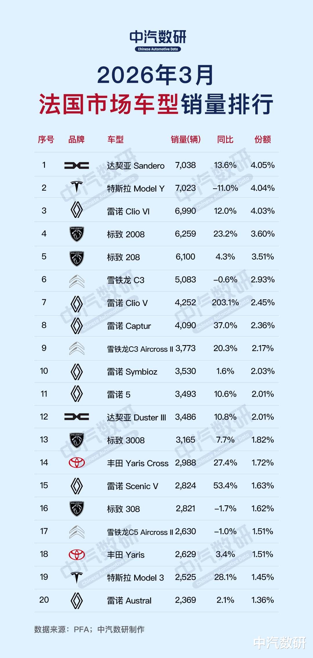 达契亚Sandero以7,038辆的销量登顶车型榜,特斯拉Model Y(7,023辆)和雷诺Clio VI(6,990辆)分别位列第二至三名,标致2008、208分居榜单第四至五位。