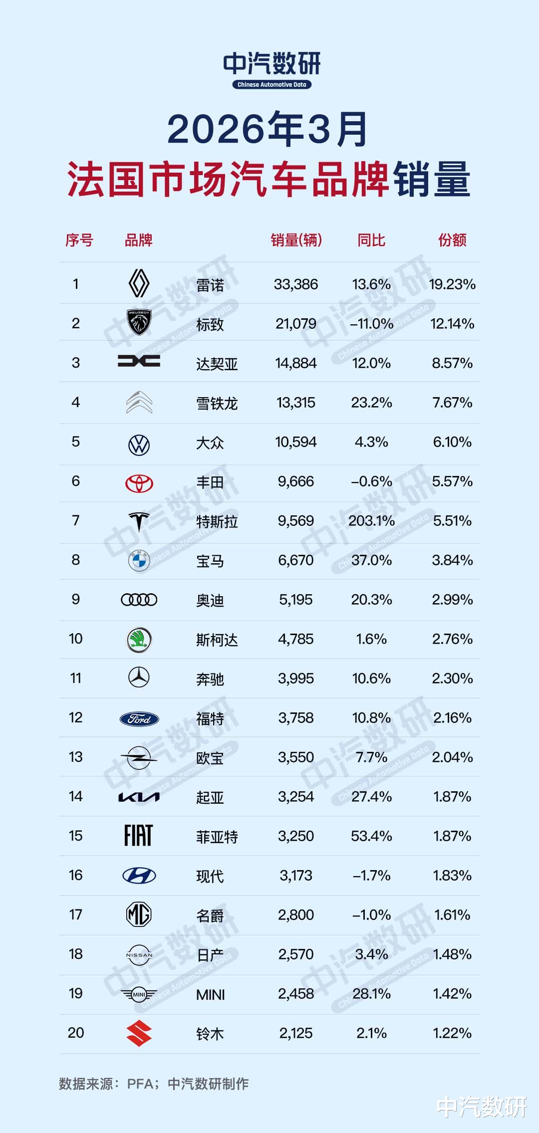 从品牌销量来看,法国本土品牌雷诺3月份销量33,386辆,市场份额19.23%,稳居品牌榜首,同比增长13.6%;标致以21,079辆的成绩位列第二,同比下滑11%;达契亚(14,884,+12.0%)、雪铁龙(13,315,+23.2%)分列第三至四位,四大本土品牌合计份额近50%。