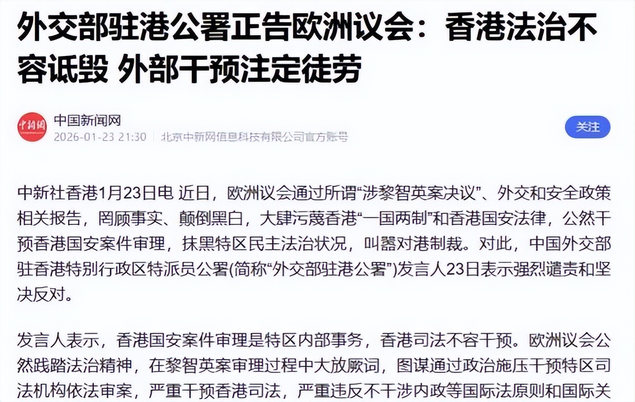 欧洲议会这次投票的真实情况2026年1月22日,欧洲议会在法国斯特拉斯堡举行全体会议,以503票赞成、9票反对、100票弃权的比例通过一份涉港决议。这份决议主要针对黎智英案件,声称审判存在问题,要求立即无条件释放他,还批评香港国安法实施情况。