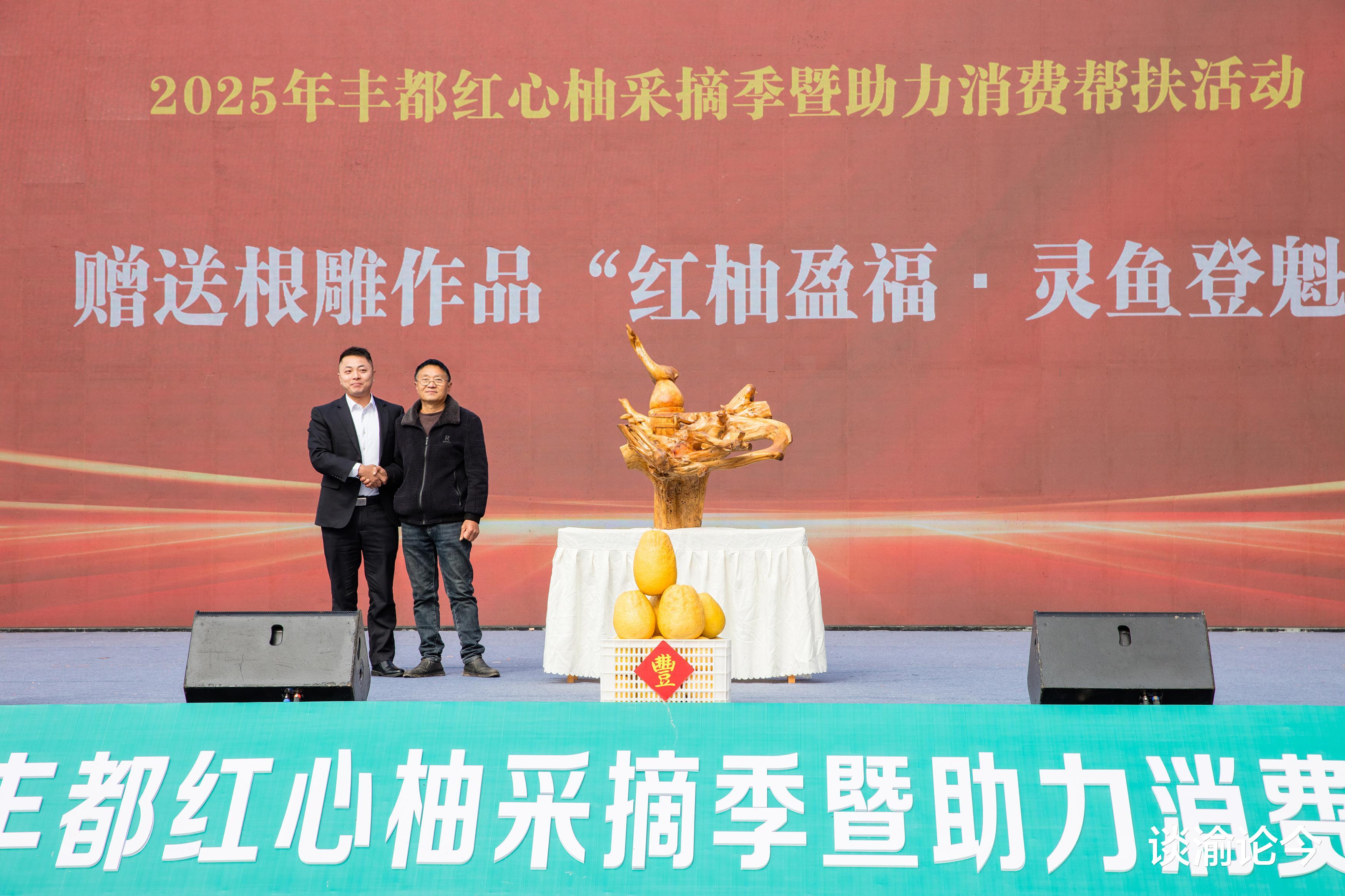 今年端午期间,杨朝江筹办的“根韵乡情——杨氏根雕非遗展”在村中亮相。四十余件作品静列展厅,既有“福禄寿喜”等传统题材,也不乏融合现代审美的创新之作,吸引了众多干部群众驻足欣赏。现场设置的体验区内,杨朝江耐心指导爱好者尝试雕刻,让参与者在刀锋与木屑的交织中亲身感受非遗魅力。随后 ,在三元镇一年一度的红心柚采摘季活动中,杨朝江赠送的根雕作品“红柚迎福 灵鱼登魁”亦备受关注,累计吸引超2000人次参与相关活动,“杨氏根雕”的知名度在全县范围内逐步提升。